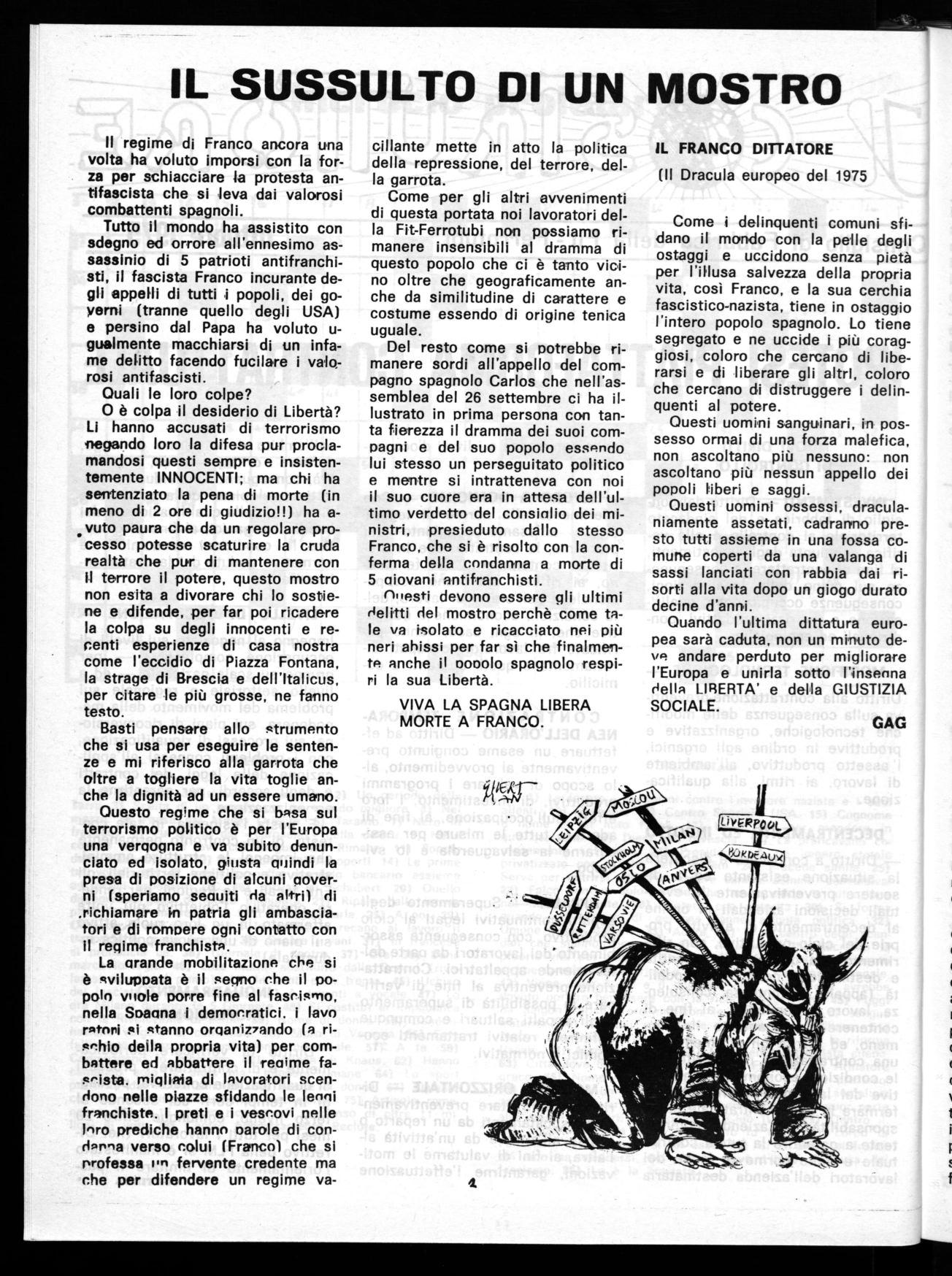 Del resto come si potrebbe rimanere sordi all'appello del compagno spagnolo Carlos che nell'assemblea del 26 settembre ci ha illustrato in prima persona con tanta fierezza il dramma dei suoi compagni e del suo popolo essendo lui stesso un perseguitato politico e mentre si intratteneva con noi il suo cuore era in attesa dell'ultimo verdetto del consiglio dei ministri, presieduto dallo stesso Franco, che si è risolto con la conferma della condanna a morte di 5 aiovani antifranchisti.