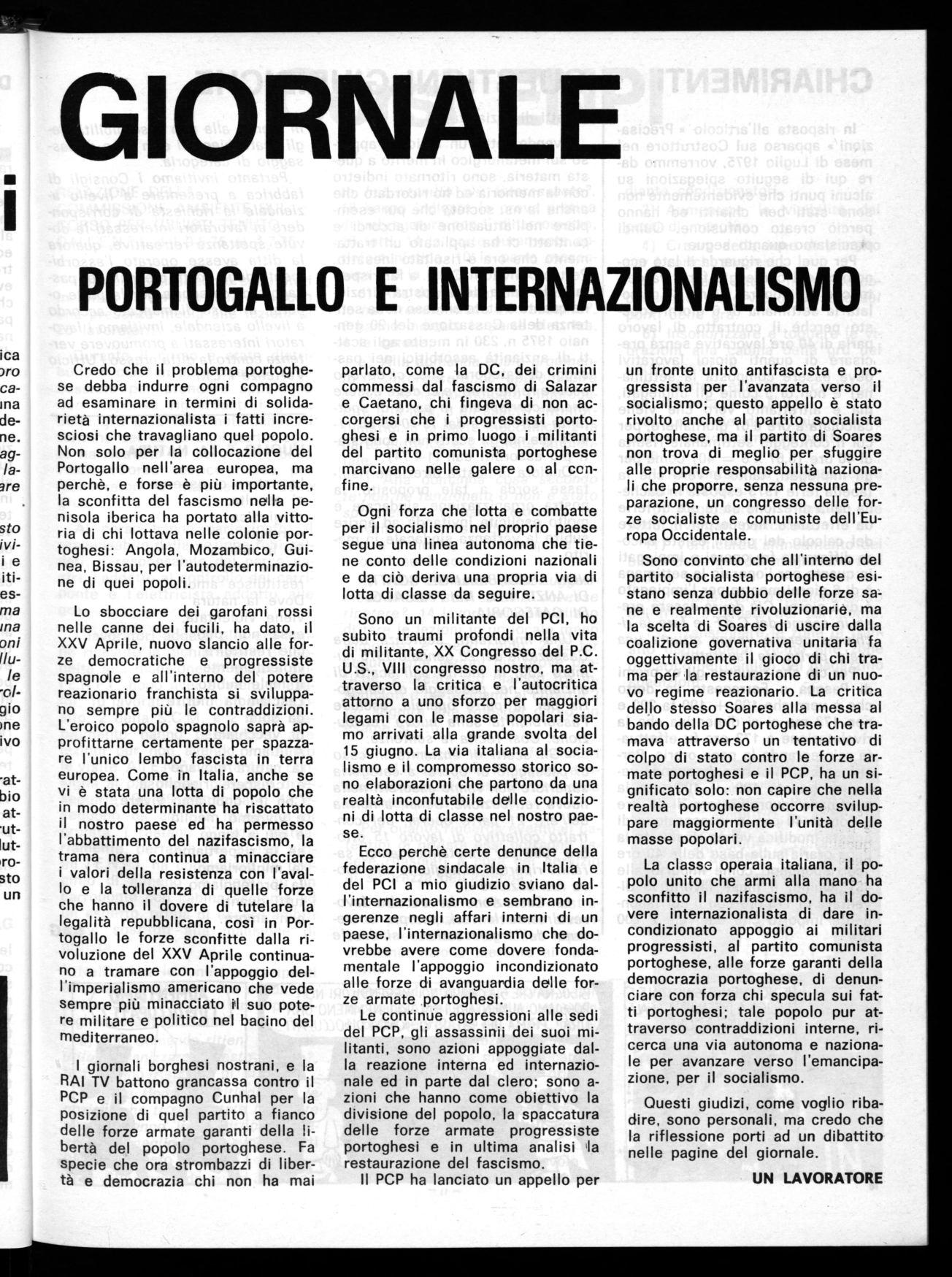 La classe operaia italiana, il popolo unito che armi alla mano ha sconfitto il nazifascismo, ha il dovere internazionalista di dare incondizionato appoggio ai militari progressisti, al partito comunista portoghese, alle forze garanti della democrazia portoghese, di denunciare con forza chi specula sui fatti portoghesi; tale popolo pur attraverso contraddizioni interne, ricerca una via autonoma e nazionale per avanzare verso l'emancipazione, per il socialismo.
