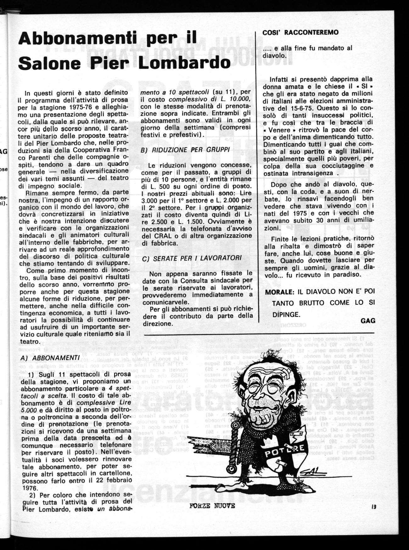 In questi giorni è stato definito il programma dell'attività di prosa per la stagione 1975-76 e alleghiamo una presentazione degli spettacoli, dalla quale si può rilevare, ancor più dello scorso anno, il carattere unitario delle proposte teatrali del Pier Lombardo che, nelle produzioni sia della Cooperativa Franco Parenti che delle compagnie ospiti, tendono a dare un quadro generale — nella diversificazione dei vari temi assunti — del teatro di impegno sociale.