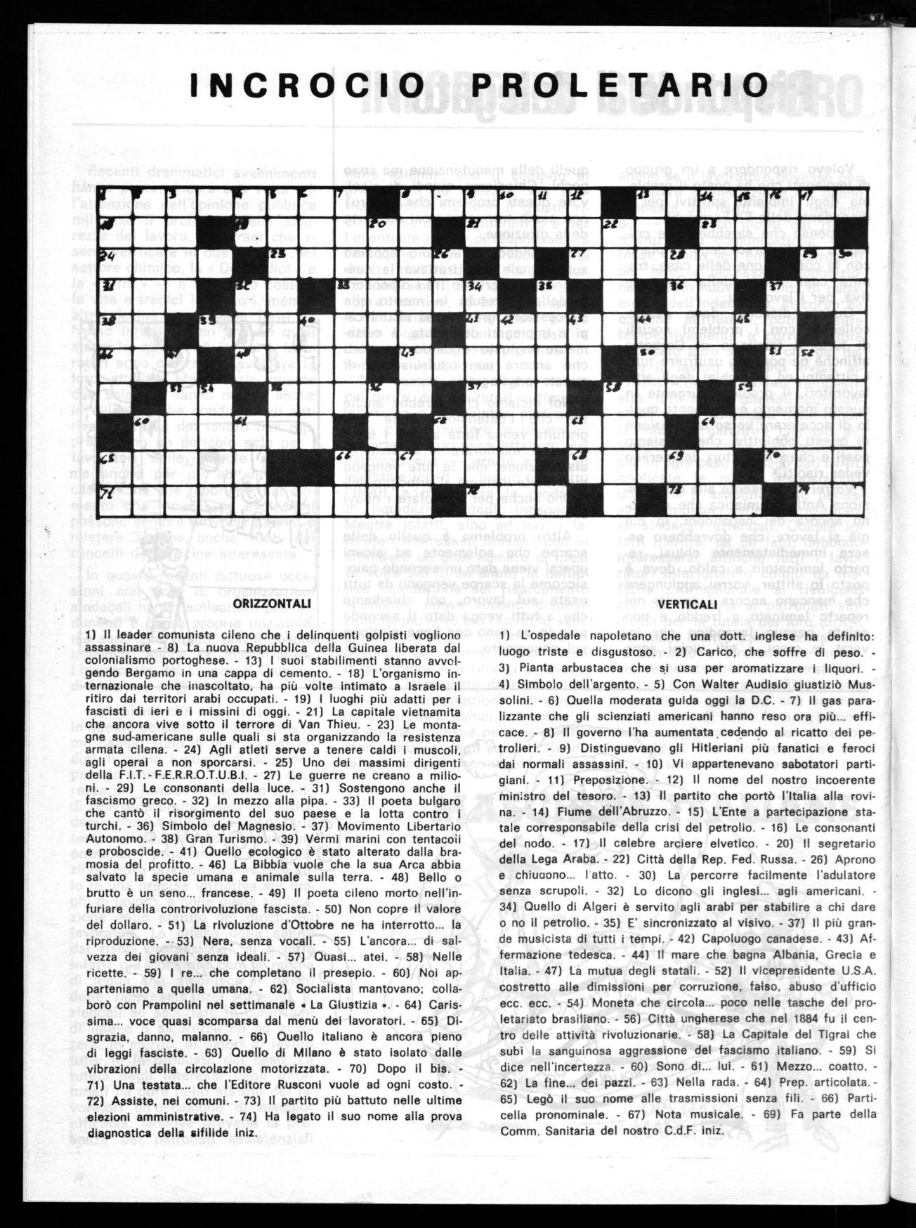 1) Il leader comunista cileno che i delinquenti golpisti vogliono assassinare - 8) La nuova Repubblica della Guinea liberata dal colonialismo portoghese. - 13) I suoi stabilimenti stanno avvolgendo Bergamo in una cappa di cemento. - 18) L'organismo internazionale che inascoltato, ha più volte intimato a Israele il ritiro dai territori arabi occupati. - 19) I luoghi più adatti per i fascisti di ieri e i missini di oggi. - 21) La capitale vietnamita che ancora vive sotto il terrore di Van Thieu. - 23) Le montagne sud-americane sulle quali si sta organizzando la resistenza armata cilena. - 24) Agli atleti serve a tenere caldi i muscoli, agli operai a non sporcarsi. - 25) Uno dei massimi dirigenti della F.I.T. - F.E.R.R.O.T.U.B.I. - 27) Le guerre ne creano a milioni. - 29) Le consonanti della luce. - 31) Sostengono anche il fascismo greco. - 32) In mezzo alla pipa. - 33) Il poeta bulgaro che cantò il risorgimento del suo paese e la lotta contro i turchi. - 36) Simbolo del Magnesio. - 37) Movimento Libertario Autonomo. - 38) Gran Turismo. - 39) Vermi marini con tentacoii e proboscide. - 41) Quello ecologico è stato alterato dalla bramosia del profitto. - 46) La Bibbia vuole che la sua Arca abbia salvato la specie umana e animale sulla terra. - 48) Bello o brutto è un seno... francese. - 49) II poeta cileno morto nell'infuriare della controrivoluzione fascista. - 50) Non copre il valore del dollaro. - 51) La rivoluzione d'Ottobre ne ha interrotto... la riproduzione. - 53) Nera, senza vocali. - 55) L'ancora... di salvezza dei giovani senza ideali. - 57) Quasi... atei. - 58) Nelle ricette. - 59) I re... che completano il presepio. - 60) Noi apparteniamo a quella umana. - 62) Socialista mantovano; collaborò con Prampolini nel settimanale • La Giustizia •. - 64) Carissima... voce quasi scomparsa dal menù dei lavoratori. - 65) Disgrazia, danno, malanno. - 66) Quello italiano è ancora pieno di leggi fasciste. - 63) Quello di Milano è stato isolato dalle vibrazioni della circolazione motorizzata. - 70) Dopo il bis.Una testata... che l'Editore Rusconi vuole ad ogni costo.Assiste, nei comuni. - 73) Il partito più battuto nelle ultime elezioni amministrative. - 74) Ha legato il suo nome alla prova diagnostica della sifilide iniz.