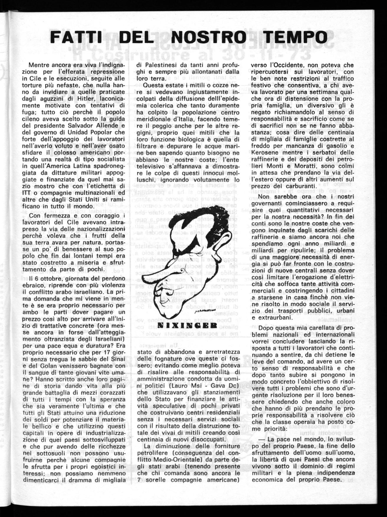 Mentre ancora era viva l'indignazione per l'efferata repressione in Cile e le esecuzioni, seguite alle torture più nefaste, che nulla hanno da invidiare a quelle praticate dagli aguzzini di Hitler, laconicamente motivate con tentativi di fuga; tutto ciò perchè il popolo cileno aveva scelto sotto la guida del presidente Salvador Allende e del governo di Unidad Popolar che forte dell'appoggio dei lavoratori nell'averlo voluto e nell'aver osato sfidare il colosso americano portando una realtà di tipo socialista in quell'America Latina spadroneggiata da dittature militari appoggiate e finanziate da quel mai sazio mostro che con l'etichetta di ITT o compagnie multinazionali ed altre che dagli Stati Uniti si ramificano in tutto il mondo.