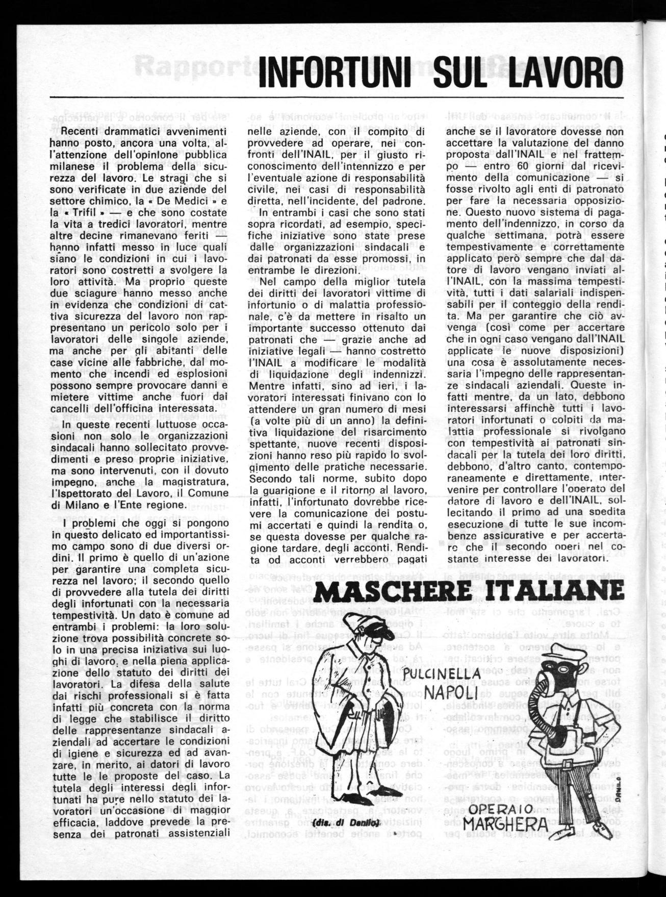 Recenti drammatici avvenimenti hanno posto, ancora una volta, all'attenzione dell'opinione pubblica milanese il problema della sicurezza del lavoro. Le stragi che si sono verificate in due aziende del settore chimico, la » De Medici » e la » Trifil ■ — e che sono costate la vita a tredici lavoratori, mentre altre decine rimanevano feriti — hanno infatti messo in luce quali siano le condizioni in cui i lavoratori sono costretti a svolgere la loro attività. Ma proprio queste due sciagure hanno messo anche in evidenza che condizioni di cattiva sicurezza del lavoro non rappresentano un pericolo solo per i lavoratori delle singole aziende, ma anche per gli abitanti delle case vicine alle fabbriche, dal momento che incendi ed esplosioni possono sempre provocare danni e mietere vittime anche fuori dai cancelli dell'officina interessata.