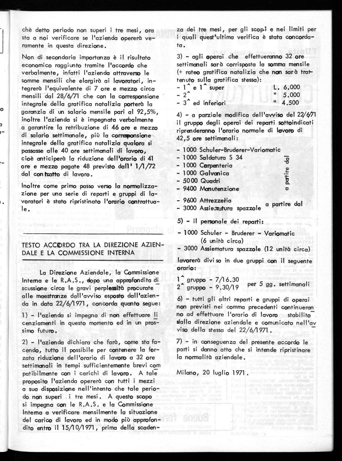 Non di secondaria importanza è il risultato economico raggiunto tramite l'accordo che verbalmente, infatti l'azienda attraverso le somme mensili che elargirà ai lavoratori, integrerà l'equivalente di 7 ore e mezzo circa mensili dal 28/6/71 che con la corresponsione integrale della gratifica natalizia porterà la o garanzia di un salario mensile pari al 92,5%, inoltre l'azienda si è impegnata verbalmente a garantire la retribuzione di 46 ore e mezzo di salario settimanale, più la corresponsione integrale della gratifica natalizia qualora si passasse alle 40 ore settimanali di lavoro, cioè anticiperà la riduzione dell'orario di 41 ore e mezzo pagate 48 previsto dall' 1/1/72 dal con tr.atto di lavoro.