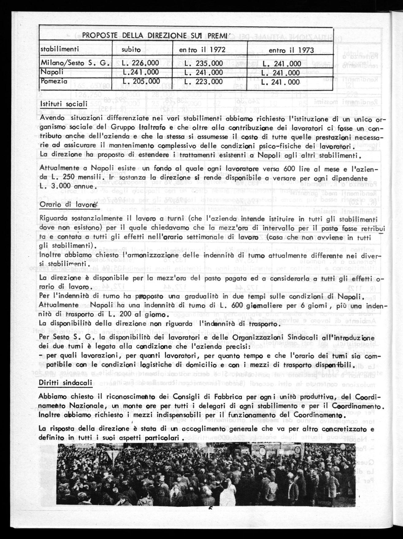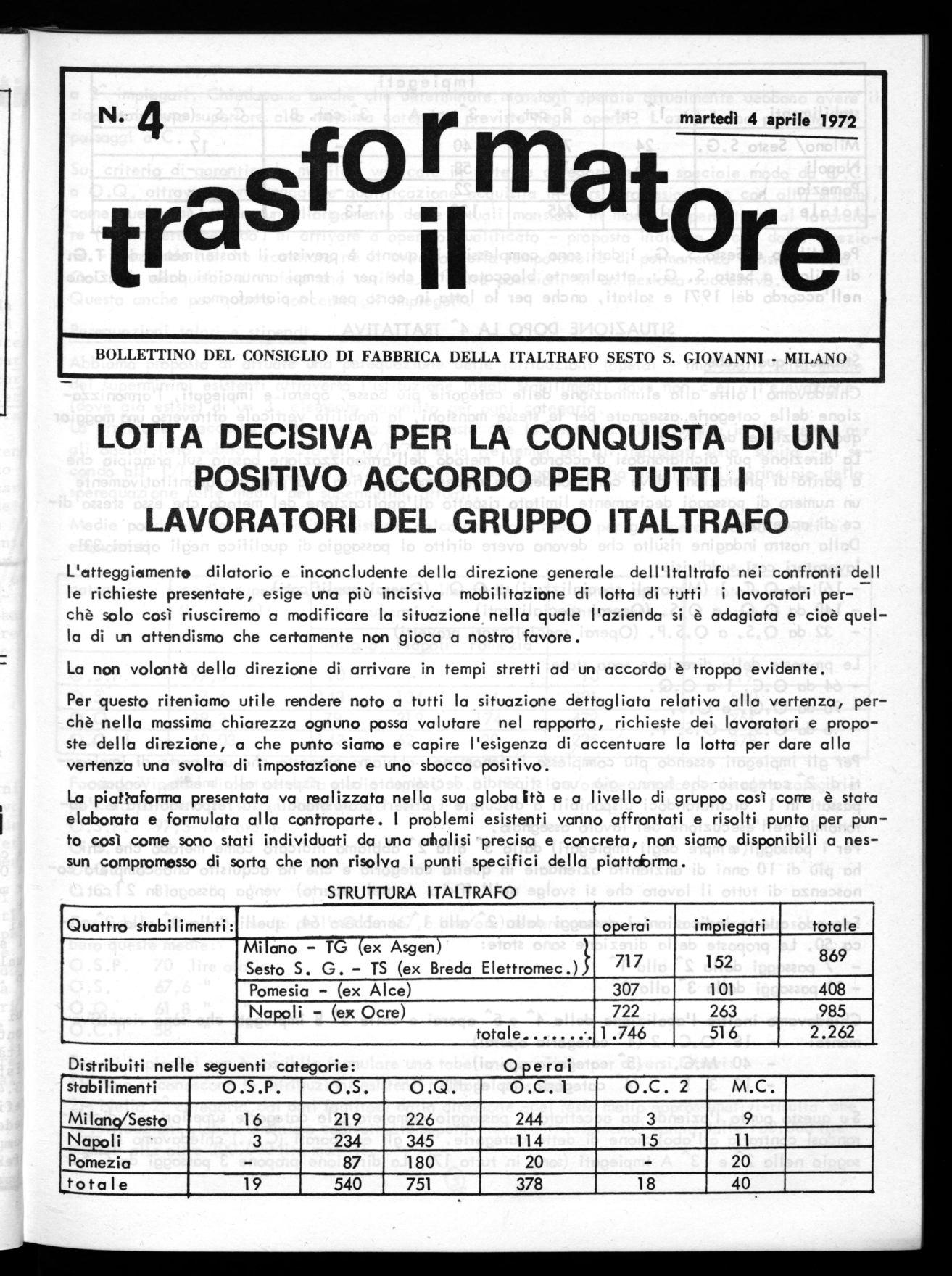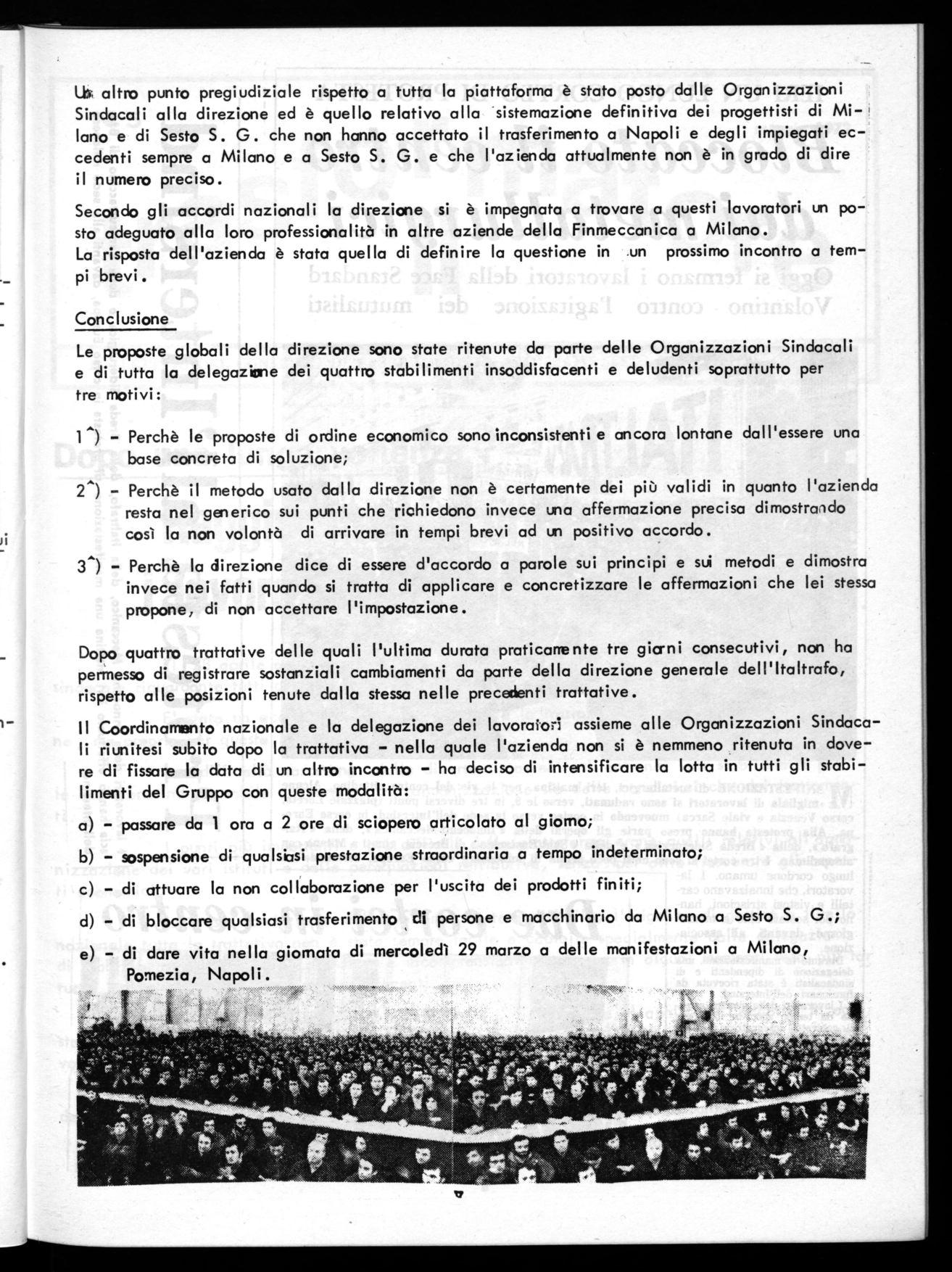 L'atteggiamento dilatorio e inconcludente della direzione generale dell'Italtrafo nei confronti dell le richieste presentate, esige una più incisiva mobilitazione di lotta di tutti i lavoratori perchè solo così riusciremo a modificare la situazione nella quale l'azienda si è adagiata e cioè quella di un attendismo che certamente non gioca a nostro favore.