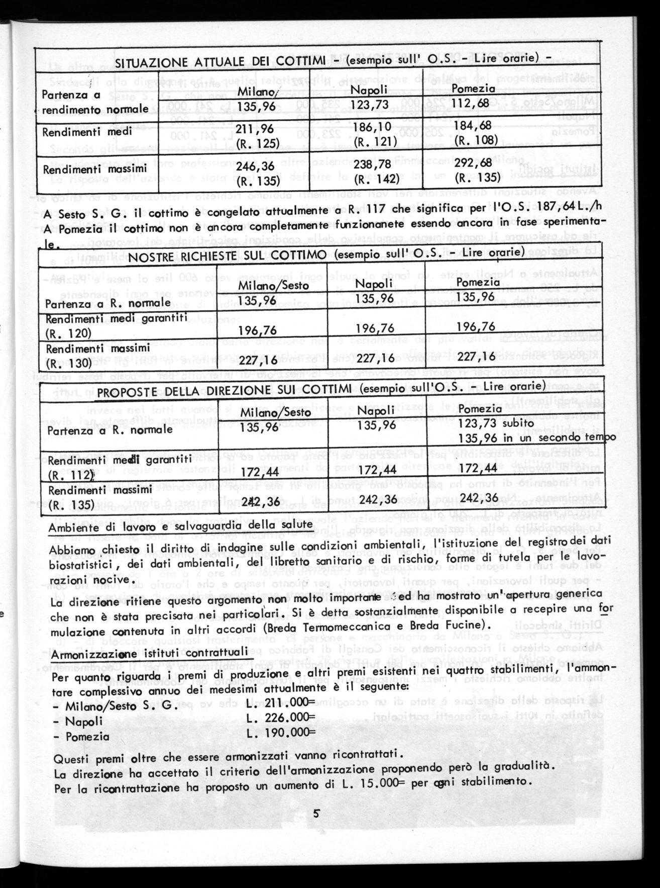 A Sesto S. G. il cottimo è congelato attualmente a R. 117 che significa per l'O.S. 187,64L./h A Pomezia il cottimo non è ancora completamente funzionanete essendo ancora in fase sperimenta,le.
