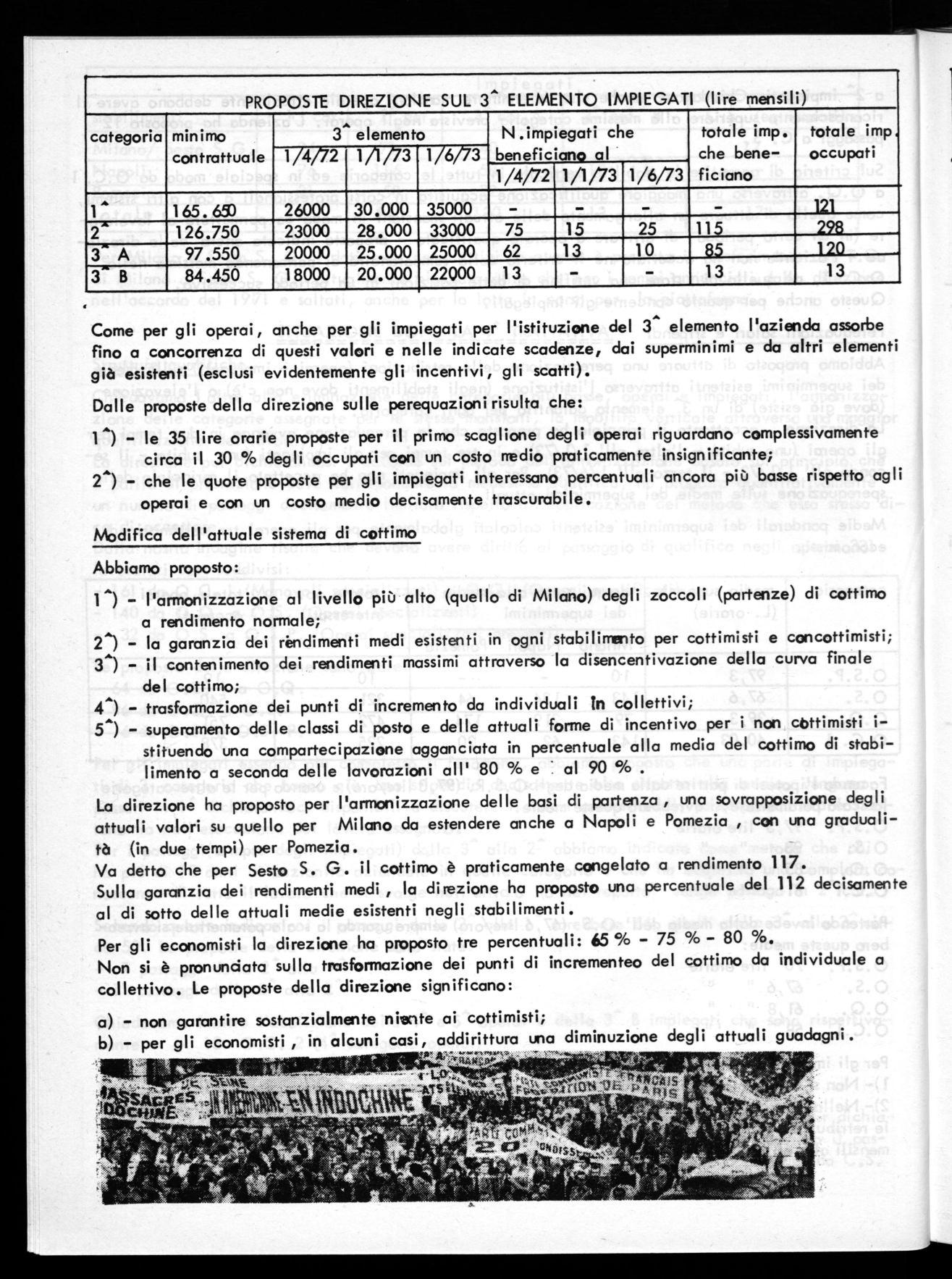 Abbiamo proposto di attuare una perequazione delle retribuzioni (operai - impiegati) sulle medie dei superminimi esistenti attraverso l'istituzione (negli stabilimenti dove non c'è) o l'elevazione (dove già esiste) di un 3 elemento garantito per ogni categoria.