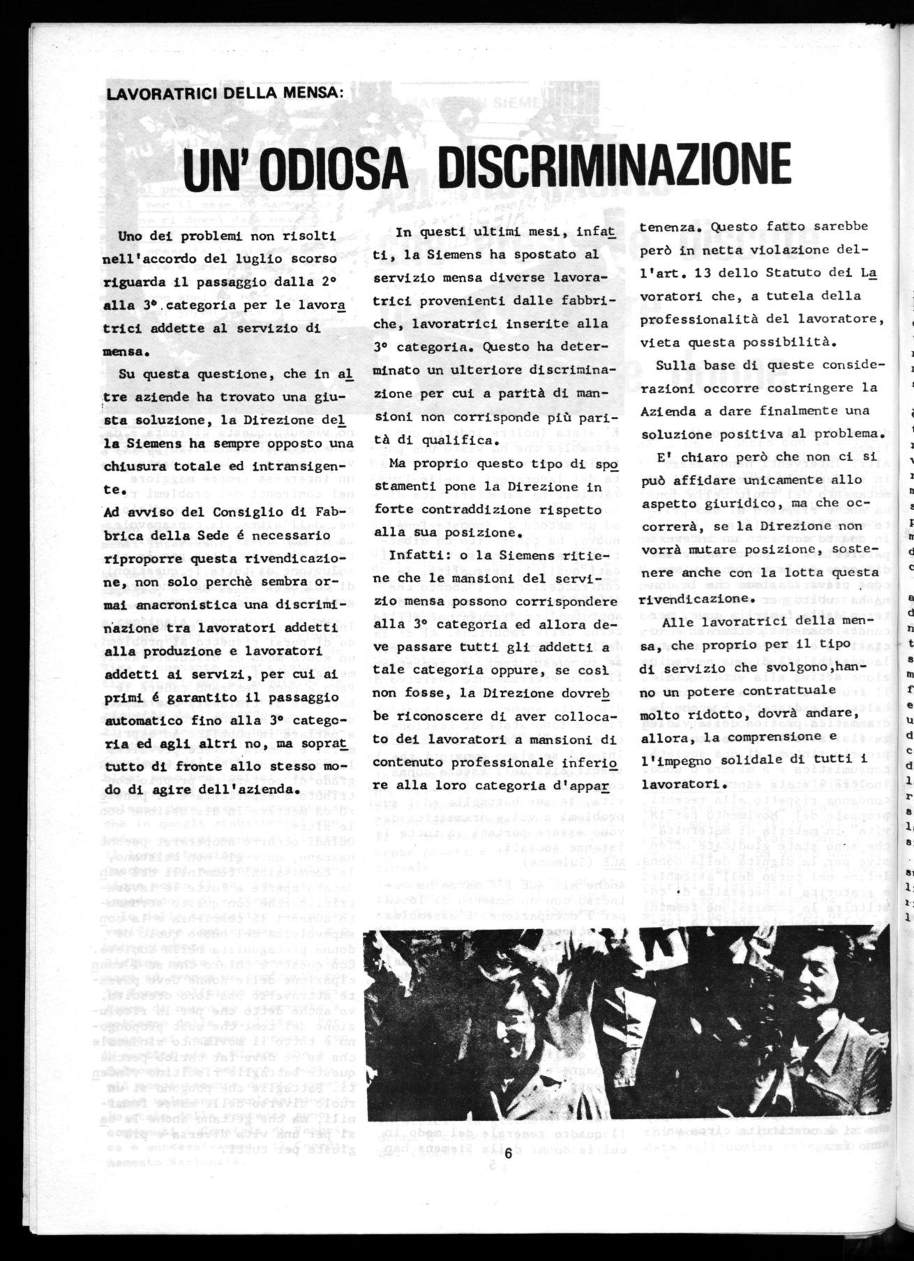 In questi ultimi mesi, infat ti, la Siemens ha spostato al servizio mensa diverse lavoratrici provenienti dalle fabbriche, lavoratrici inserite alla 3° categoria. Questo ha determinato un ulteriore discriminazione per cui a parità di mansioni non corrisponde più parità di qualifica.