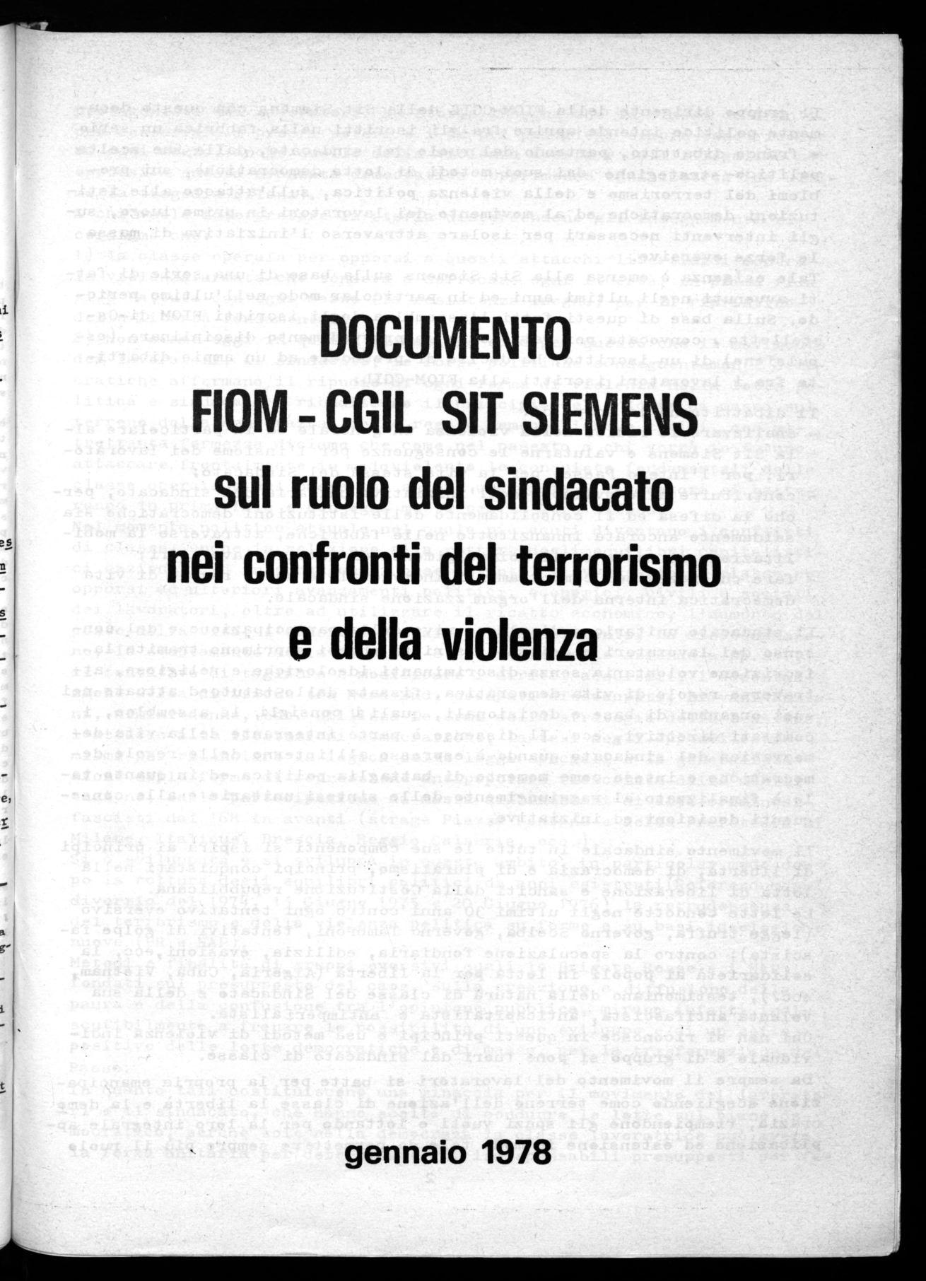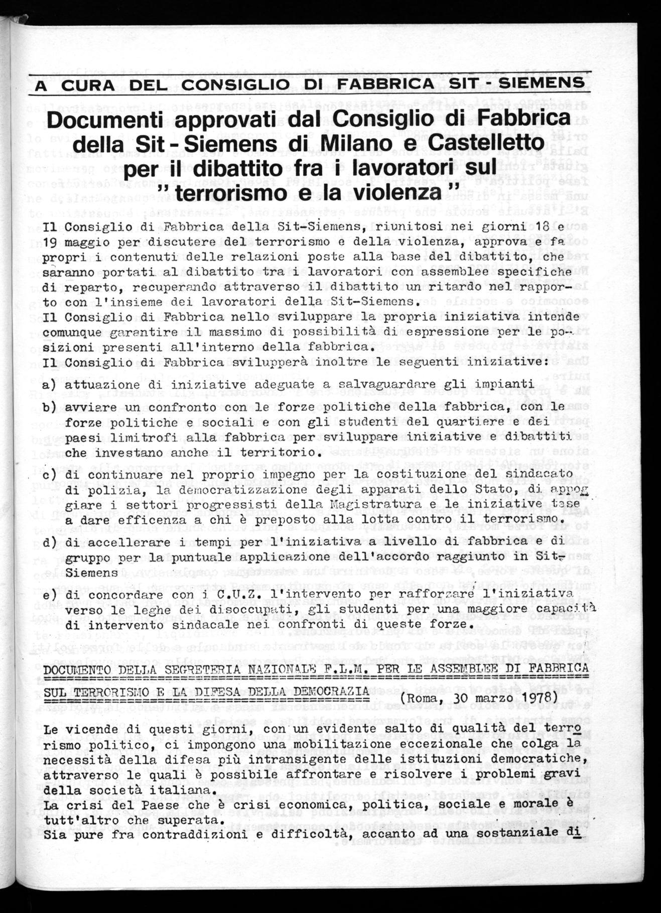 Il Consiglio di Fabbrica della Sit—Siemens, riunitosi nei giorni 18 e 19 maggio per discutere del terrorismo e della violenza, approva e fa propri i contenuti delle relazioni poste alla base del dibattito, che saranno portati. al dibattito tra i lavoratori con assemblee specifiche di reparto, recuperando attraverso il dibattito un ritardo nel rappor— to con l'insieme dei lavoratori della Sit—Siemens.