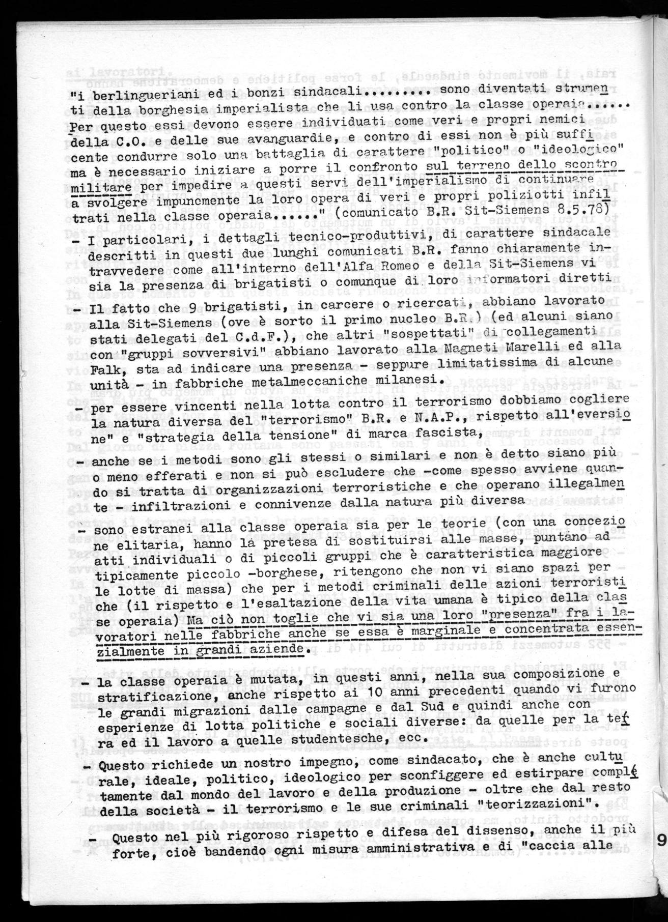 - Il fatto che 9 brigatisti, in carcere o ricercati, abbiano lavorato alla Sit-Siemens (ove è sorto il primo nucleo B.R) (ed alcuni siano stati delegati del C.d.F.), che altri "sospettati" di -collegamenti con "gruppi sovversivi" abbiano lavorato alla Magneti Marelli ed alla Palk, sta ad indicare una presenza - seppure limitatissima di alcune unità - in fabbriche metalmeccaniche milanesi.