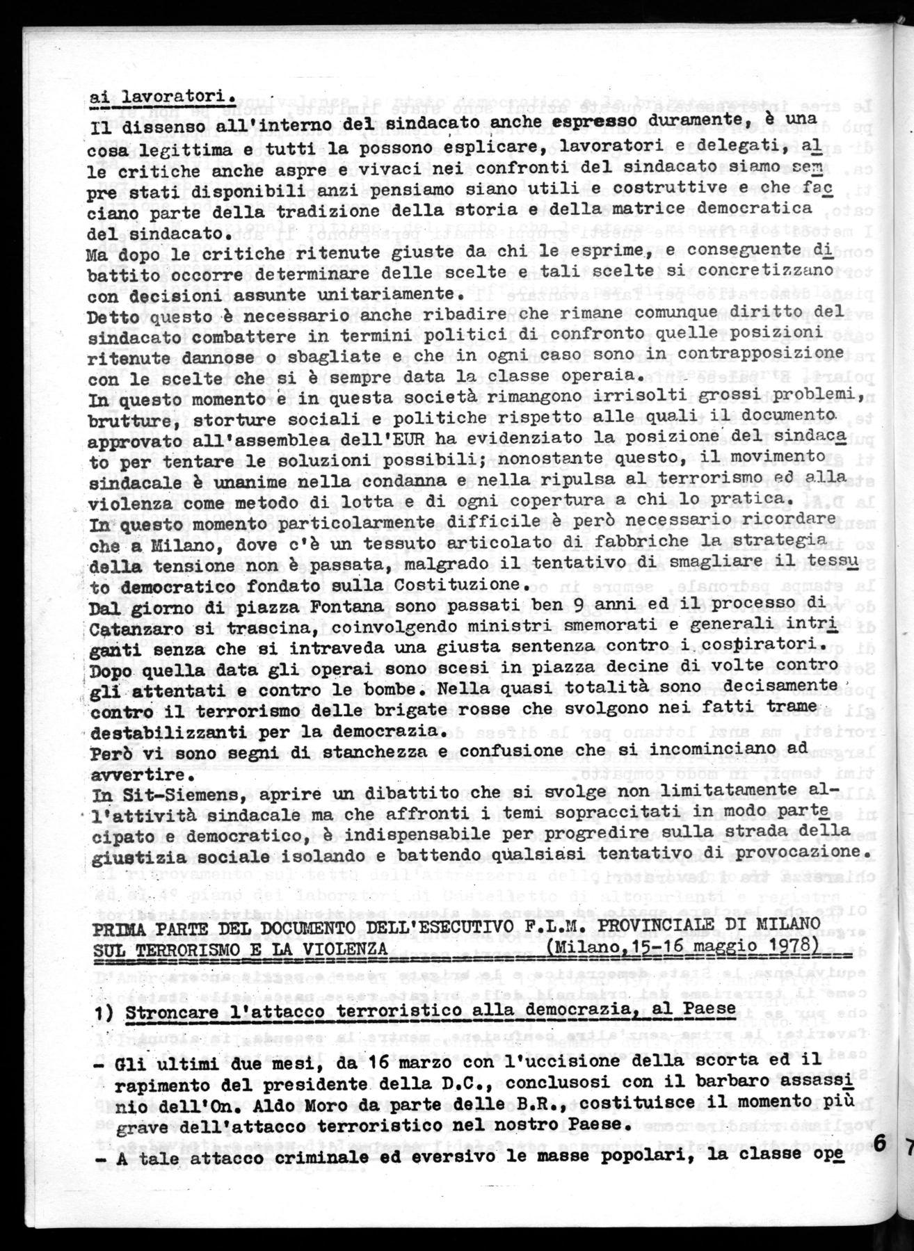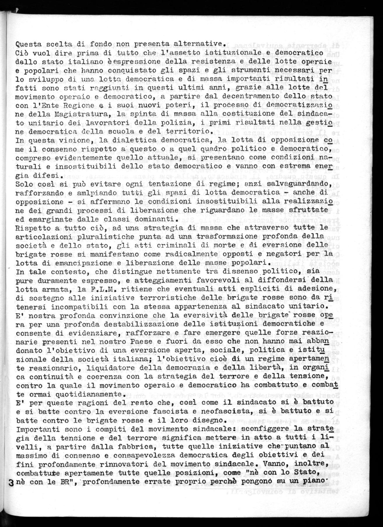 La F.L.M. Nazionale ritiene, del resto, che le stesse misure adottate dal Governo con il consenso dei partiti della maggioranza non possono che rappresentare un momento di provvisorietà e transitorietà; il nostro Paese infatti ha forze e strumenti sufficienti per difendersi e debella re il terrorismo senza modificare la propria natura di stato democratico. Anzi la parteCipazione dei lavoratori e dei cittadini, la lotta democrati ca e di massa si presentano, in tutti i casi, come gli stumenti decisivi per battere la eversione e il terrorismo e quindi mantenere aperta la strada ad un profondo rinnovamento della società e ea.11o stato.
