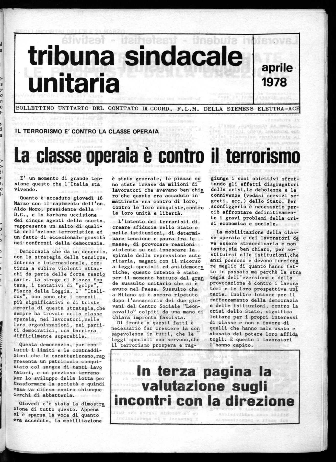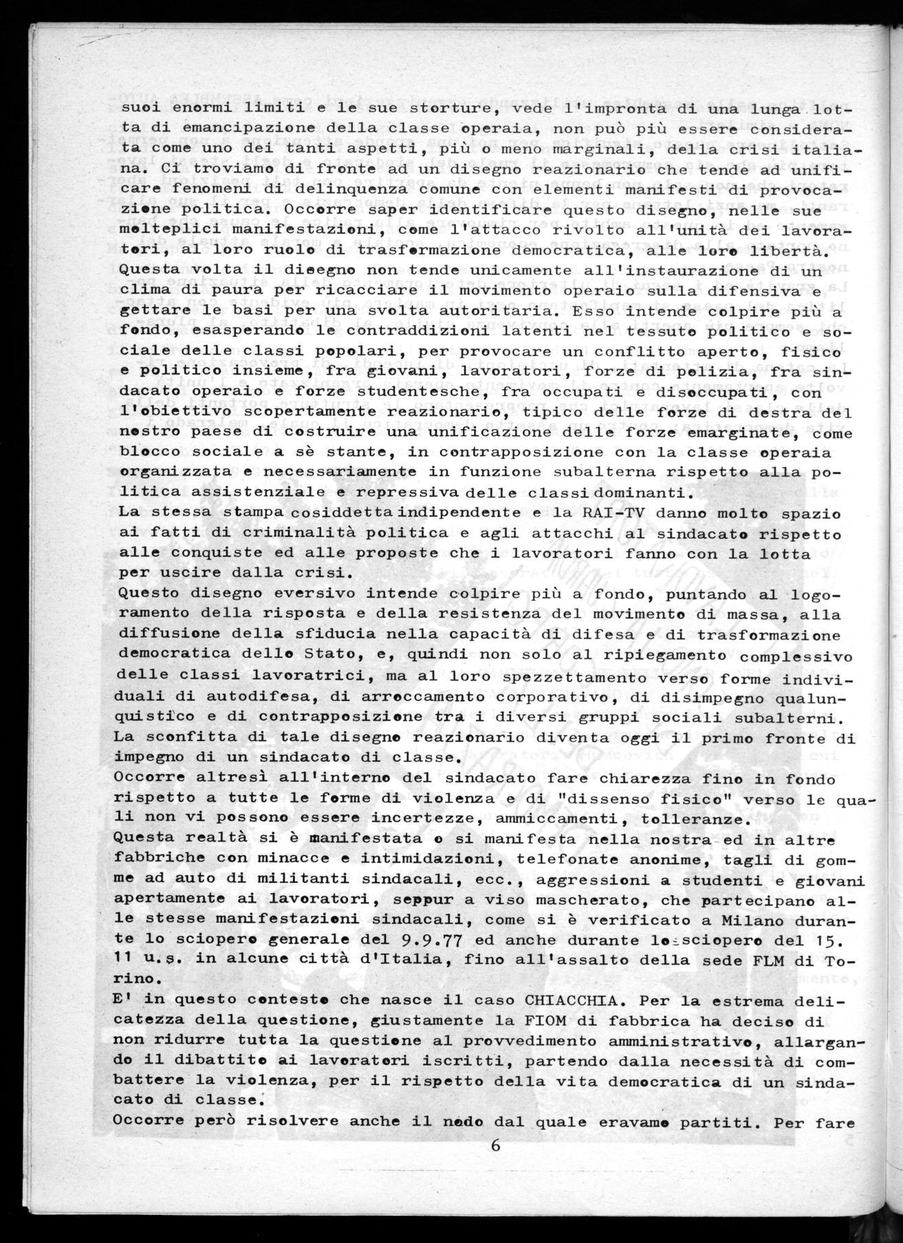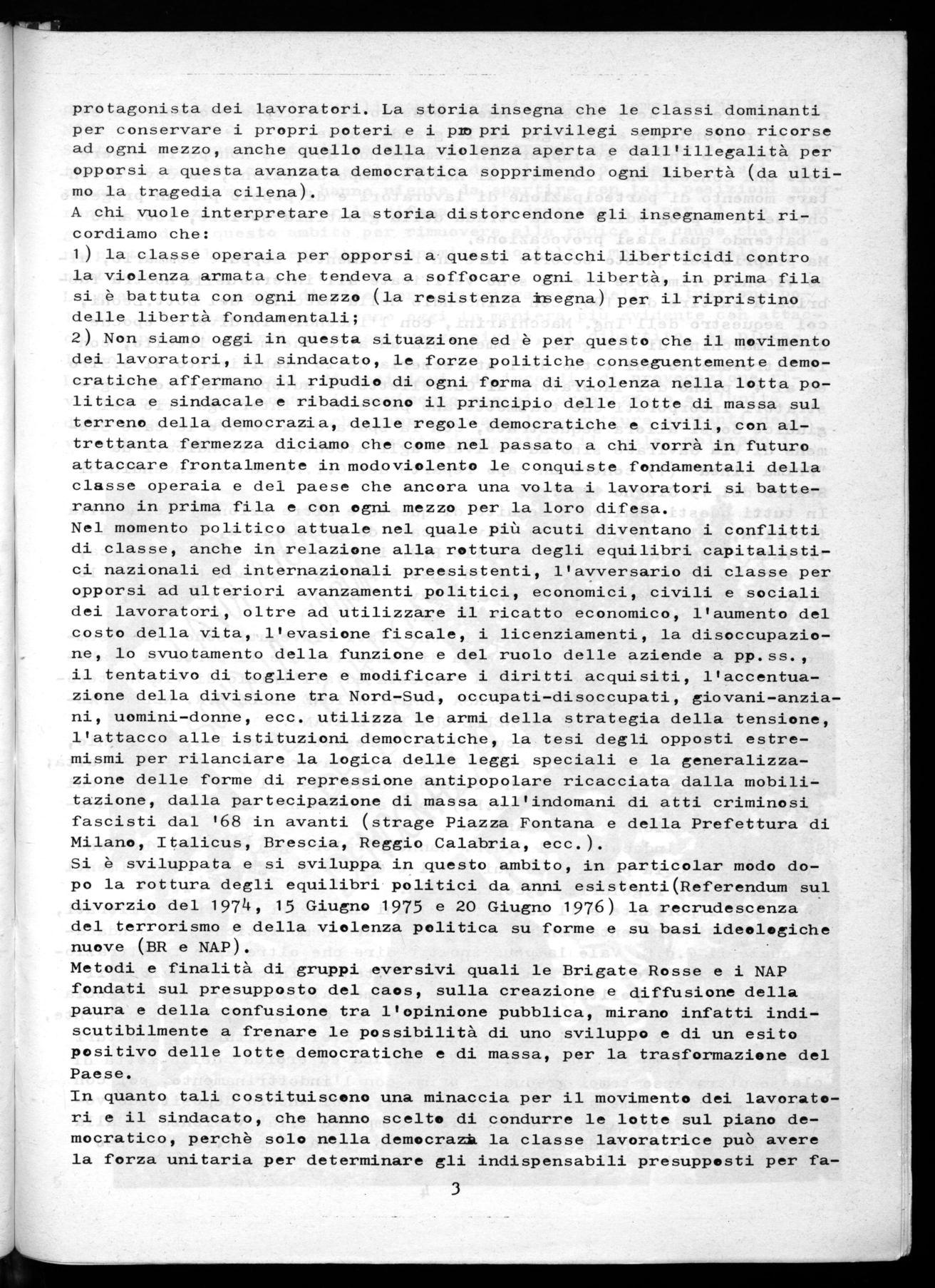 Sottolineare questo significa anche, che come consiglio di fabbrica non possiamo più permettere che sia compromesso il ruolo del sindacato e degli stessi lavoratori che non solo non hanno nulla da spartire con i ter roristi, ma anzi lottano per la difesa della democrazia e per il suo al largamento, con fermezza e decisione, come hanno dimostrato in questi ul timi tempi, in modo compatto.