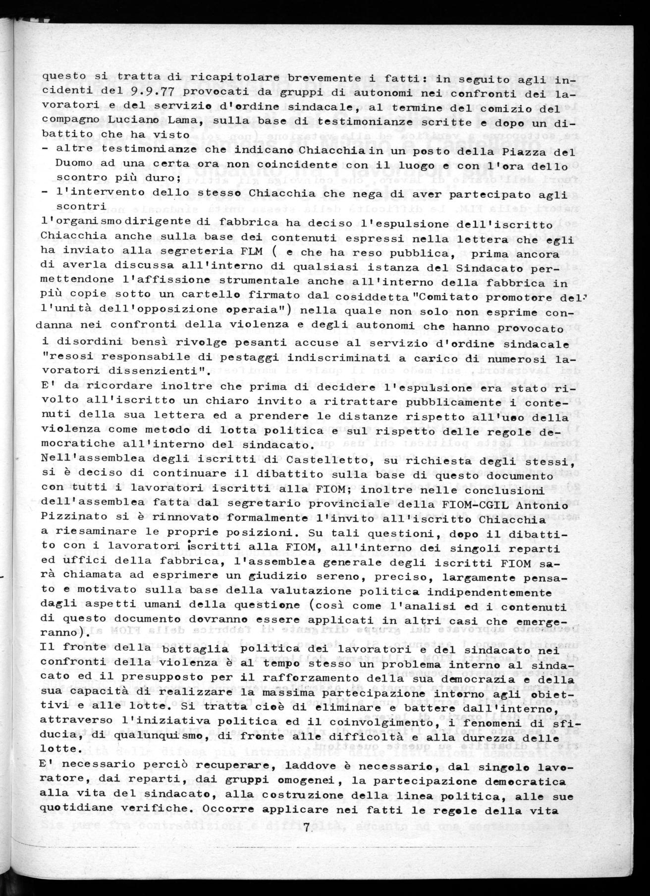 la nostra opposizione e condanna nei confronti della violenza come forma di lotta politica: chi usa questa violenza, chi la pratica, chi la giustifica si pone fuori dal sindacato ancora prima che sia il sindacato ad assumere questa decisione; assunzione del metodo del confronto anche aspro, della lotta politica nei confronti di quelle posizioni che riteniamo sbagliate e che non certamente pensiamo di isolare soltanto sul piano amministrativo.