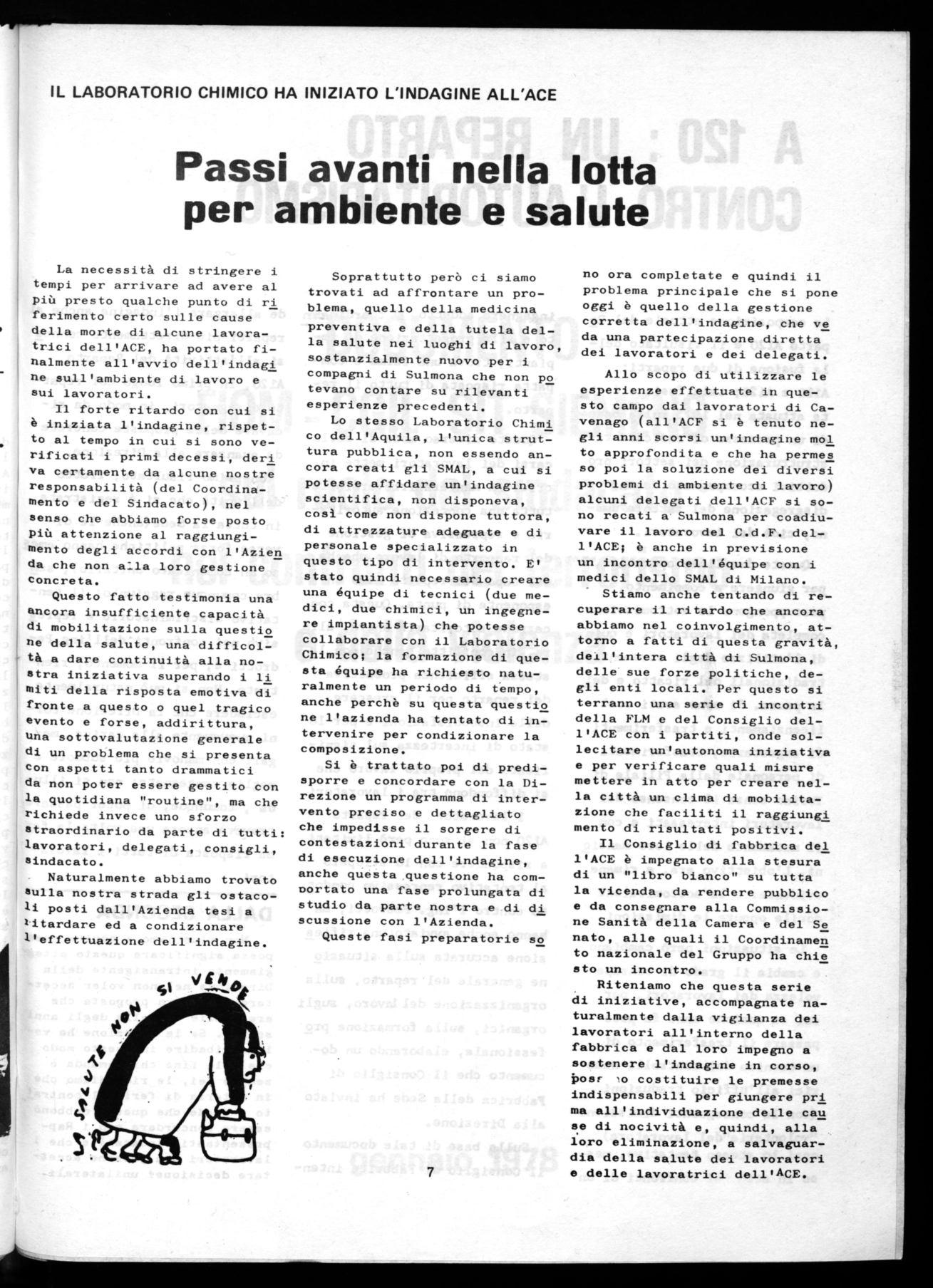Riteniamo che questa serie di iniziative, accompagnate naturalmente dalla vigilanza dei lavoratori all'interno della fabbrica e dal loro impegno a sostenere l'indagine in corso, posi ,o costituire le premesse indispensabili per giungere pri ma all'individuazione delle cau se di nocività e, quindi, alla loro eliminazione, a salvaguardia della salute dei lavoratori e delle lavoratrici dell'ACE.
