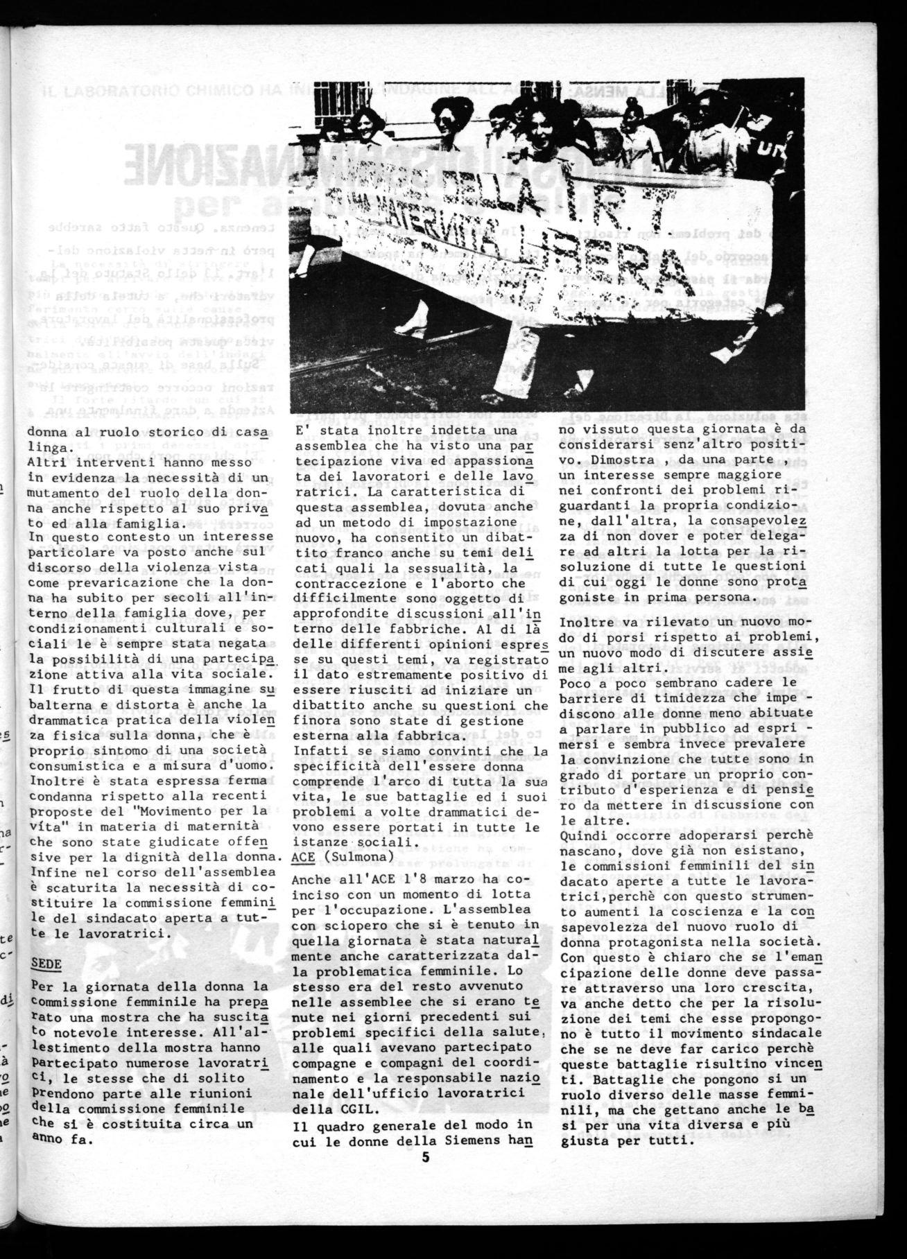 Altri interventi hanno messo in evidenza la necessità di un mutamento del ruolo della donna anche rispetto al suo priva to ed alla famiglia. In questo contesto un interesse particolare va posto anche sul discorso della violenza vista come prevaricazione che la donna ha subito per secoli all'interno della famiglia dove, per condizionamenti culturali e sociali le è sempre stata negata la possibilità di una partecipa zione attiva alla vita sociale. Il frutto di questa immagine su balterna e distorta è anche la drammatica pratica della violen za fisica sulla donna, che è proprio sintomo di una società consumistica e a misura d'uomo. Inoltre è stata espressa ferma condanna rispetto alla recenti Proposte del "Movimento per la vita" in materia di maternità che sono state giudicate offen sive per la dignità della donna. Infine nel corso dell'assemblea è scaturita la necessità di costituire la commissione femmini le del sindacato aperta a tutte le lavoratrici.