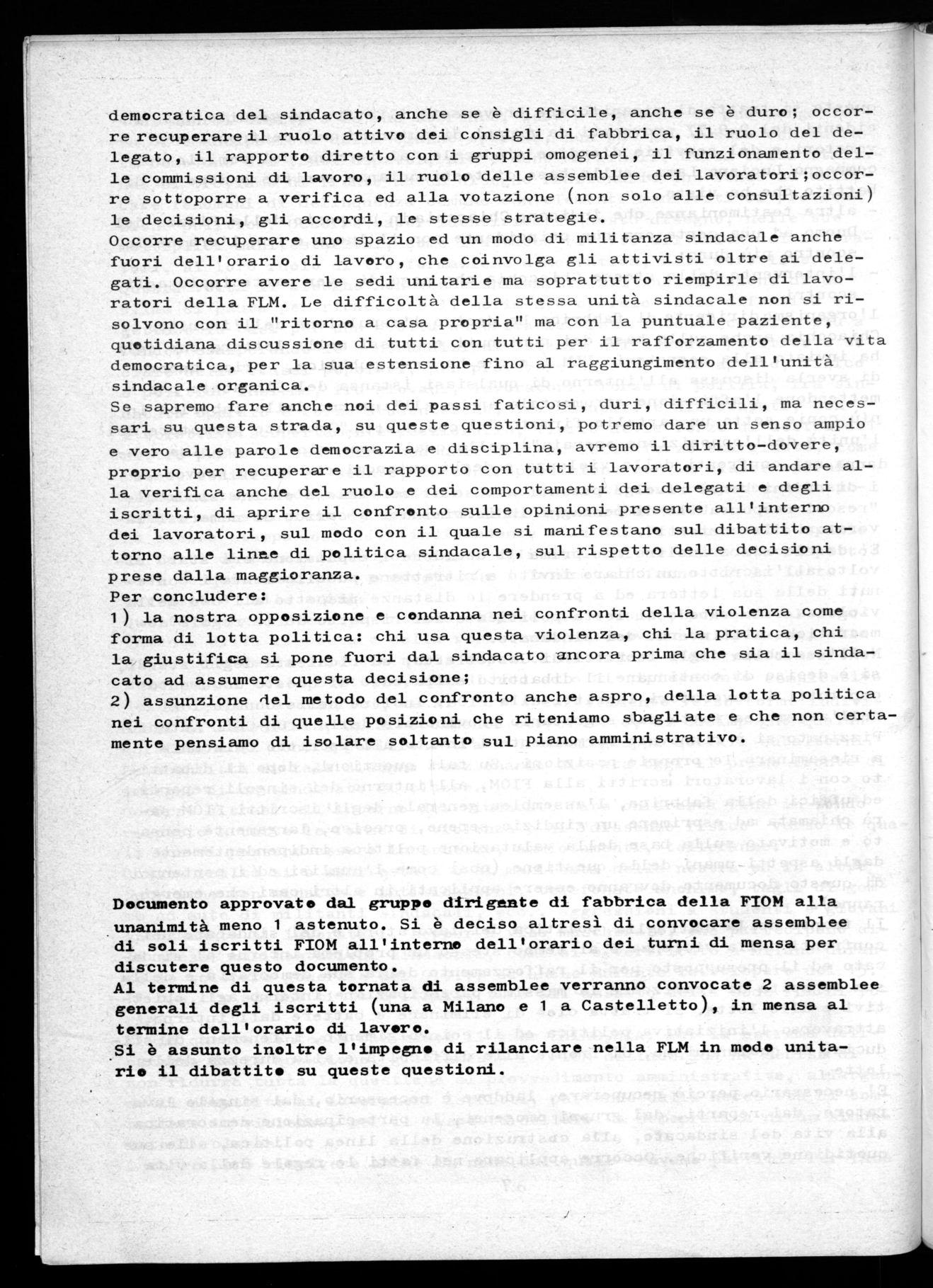 Il Consiglio di Fabbrica prendendo atto delle mozioni approvate al— l'unanimità da alcuni reparti di Castelletto decide di andare ad una verifica dei delegati stessi all'interno del loro gruppo omogeneo per una discussione di merito adeguata, rispetto alle posizioni assunte dagli stessi sulla base dei documenti e dallo spirito democratico che ha sempre distinto il sindacato.