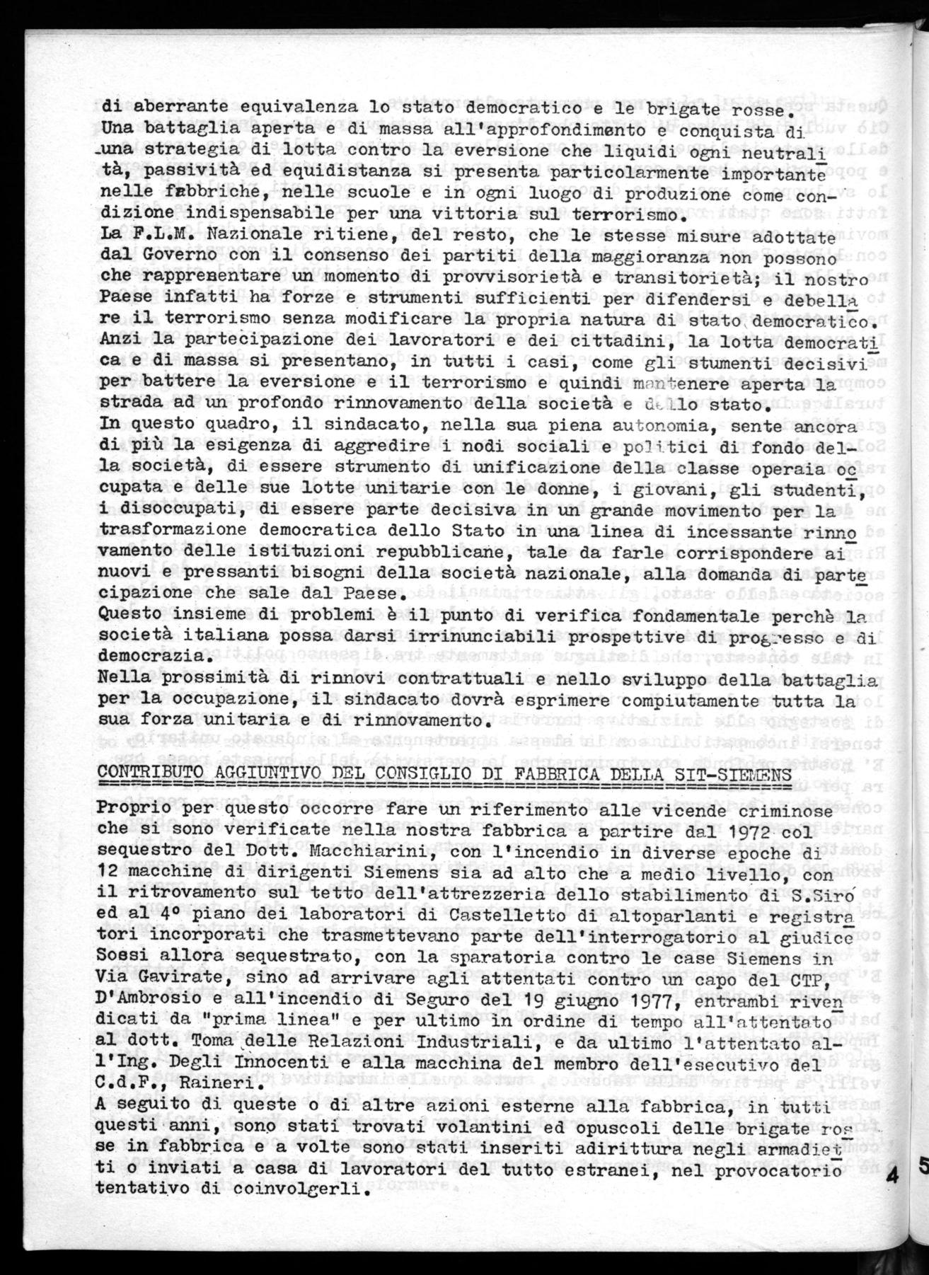 Proprio per questo occorre fare un riferimento alle vicende criminose che si sono verificate nella nostra fabbrica a partire dal 1972 col sequestro del Dott. Macchiarini, con l'incendio in diverse epoche di 12 macchine di dirigenti Siemens sia ad alto che a medio livello, con il ritrovamento sul tetto dell'attrezzeria dello stabilimento di S.Siró ed al 40 piano dei laboratori di Castelletto di altoparlanti e registra tori incorporati che trasmettevano parte dell'interrogatorio al giudice Soesi allora sequestrato, con la sparatoria contro le case Siemens in Via Gavirate, sino ad arrivare agli attentati contro un capo del CTP, D'Ambrosio e all'incendio di Seguro del 19 giugno 1977, entrambi riven dicati da "prima linea" e per ultimo in ordine di tempo all'attentato al dott. Torna delle Relazioni Industriali, e da ultimo l'attentato all'Ing. Degli Innocenti e alla macchina del membro dell'esecutivo del C.d.F., Raineri.