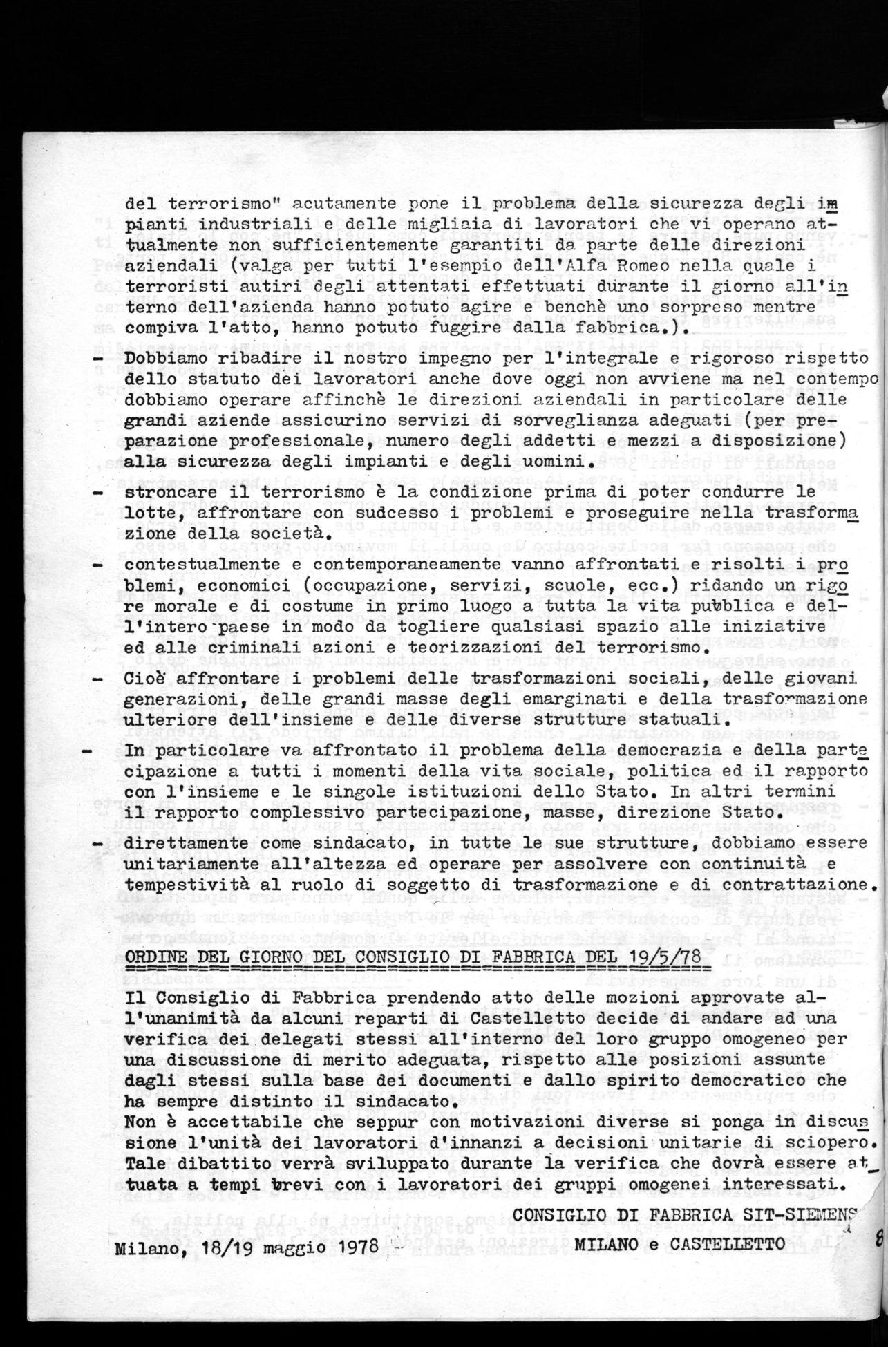 ORDINE DEL GIORNO DEL CONSIGLIO DI FABBRICA DEL 19/5/78