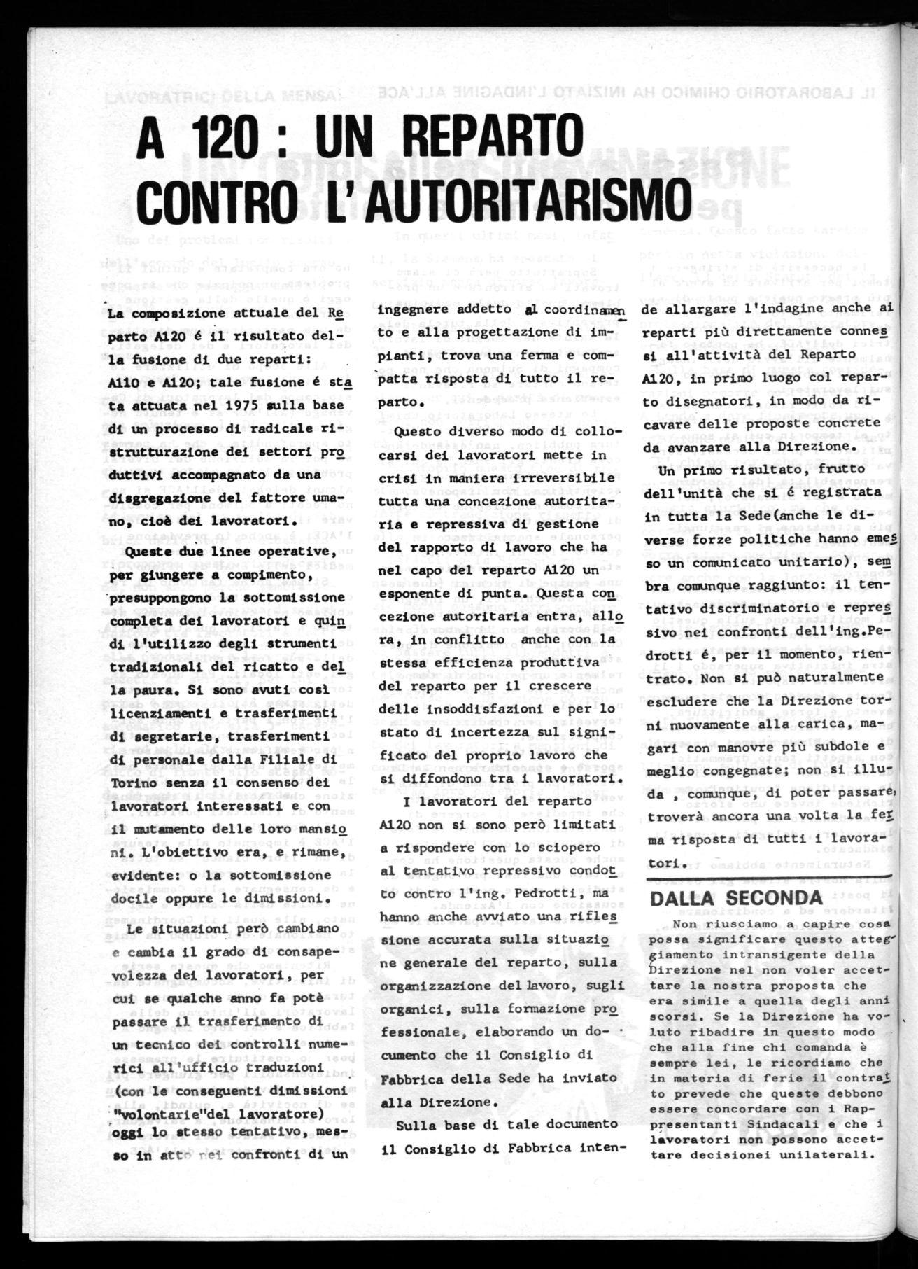 La composizione attuale del Re parto A120 é il risultato della fusione di due reparti: A110 e A120; tale fusione é sta ta attuata nel 1975 sulla base di un processo di radicale ristrutturazione dei settori pro duttivi accompagnato da una disgregazione del fattore umano, cioè dei lavoratori.