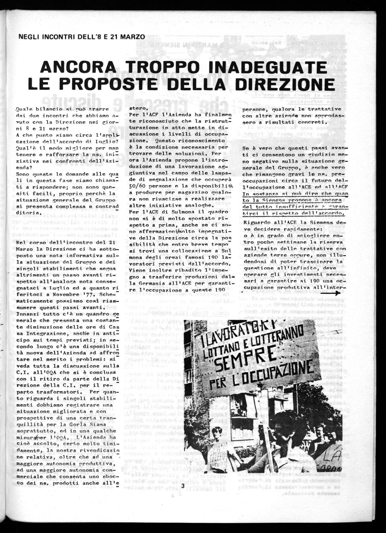 Nel. corso dell'incontro del 21 Marzo la Direzione ci ha sottoposto una nota informativa sulla situazione del Gruppo e dei singoli stabilimenti che segna altrimenti un passo avanti rispetto all'analoga nota consegnataci a Luglio ed a quanto ri feritoci a Novembre '77. Schematicamente possiamo cosa riassumere questi passi avanti. Innanzi tutto c'è un quandro ge nerale che presenta una costan: te diminuzione delle ore di Cas sa Integrazione, anche in anticipo cipo sui tempi previsti; in secondo luogo c'è una disponibili tà nuova dell'Azienda ad affro71 tare nel merito i problemi.: si veda tutta la discussione sulla C.I. all'OQA che si è conclusa con il ritiro da parte della Di rezione della C.I. per il reparto trasformatori. Per quanto riguarda i singoli stabilimenti dobbiamo registrare una situazione migliorata e con prospettive di una certa tranquillità per la Goria Siama soprattutto, ed in una qualche misura(per 1100A. L'Azienda ha cioè accolto, certo molto timidamente, la nostra rivendicazio ne relativa, oltre che ad una 7 maggiore autonomia produttiva, ad una maggiore autonomia commerciale che consenta uno sbocco dei ns. prodotti anche all'e