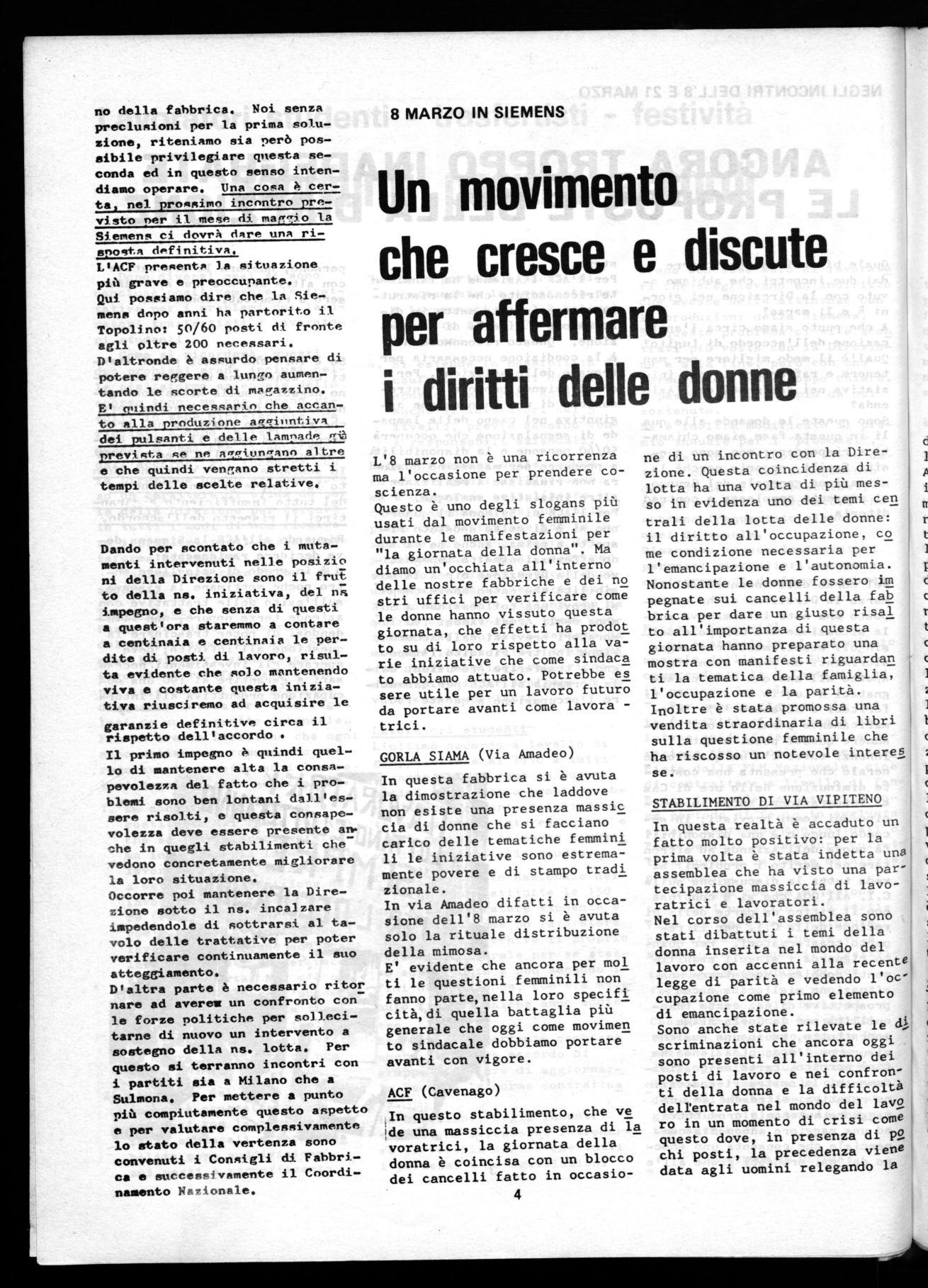 ne di un incontro con la Direzione. Questa coincidenza di lotta ha una volta di più messo in evidenza uno dei temi cen trali della lotta delle donne: il diritto all'occupazione, co me condizione necessaria per l'emancipazione e l'autonomia. Nonostante le donne fossero im pegnate sui cancelli della fab brica per dare un giusto risal to all'importanza di questa giornata hanno preparato una mostra con manifesti riguardan ti la tematica della famiglia, l'occupazione e la parità. Inoltre è stata promossa una vendita straordinaria di libri sulla questione femminile che ha riscosso un notevole interes se.