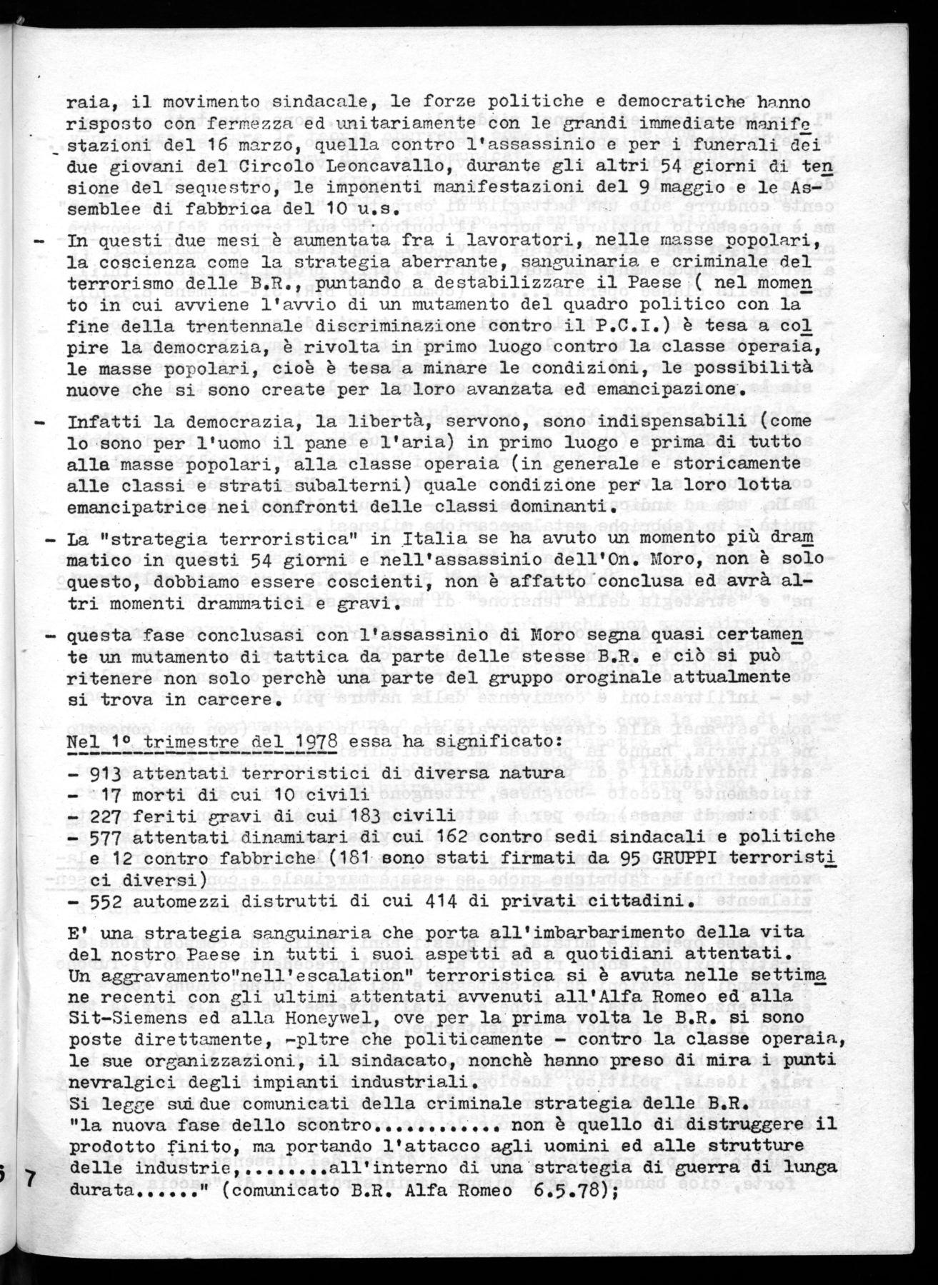 E' una strategia sanguinaria che porta all'imbarbarimento della vita del nostro Paese in tutti i suoi aspetti ad a quotidiani attentati. Un aggravamento"nell'escalation" terroristica si è avuta nelle settima ne recenti con gli ultimi attentati avvenuti all'Alfa Romeo ed alla Sit—Siemens ed alla Honeywel, ove per la prima volta le B.R. si sono poste direttamente, —pltre che politicamente — contro la classe operaia, le sue organizzazioni, il sindacato, nonchè hanno preso di mira i punti nevralgici degli impianti industriali.