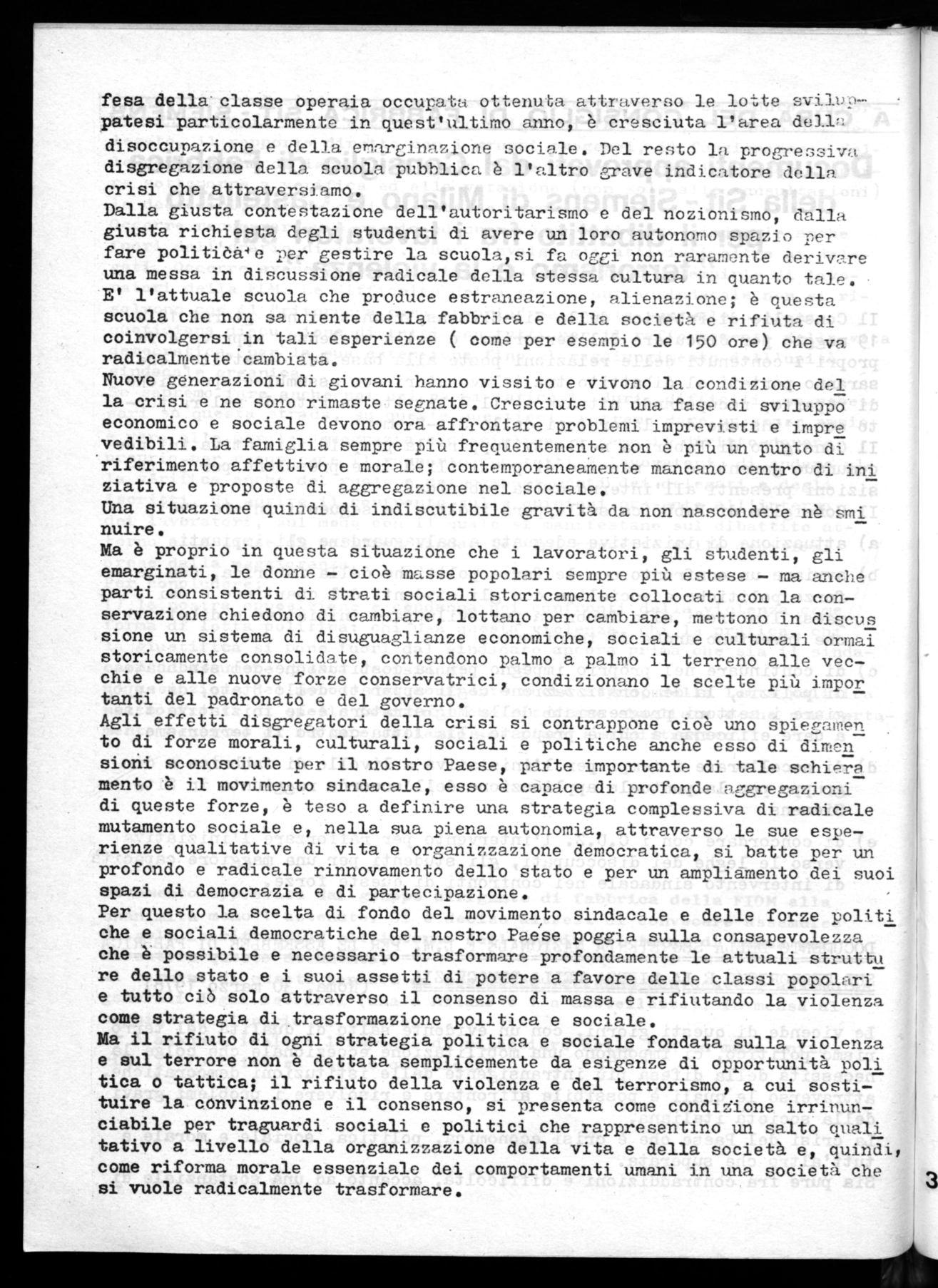 In questo momento 'e in questa società rimangono irrisolti grossi problemi, brutture, storture sociali e politiche rispetto alle quali il documenta approvato all'assemblea dell'EUR ha evidenziato la posizione' del sindaca to per tentare le soluzioni possibili; nonostante questo, il movimento sindacale è unanime nella condanna e nella ripulsa al terrorismo ed alla violenza come metodo di lotta e di ogni copertura a chi lo pratica.