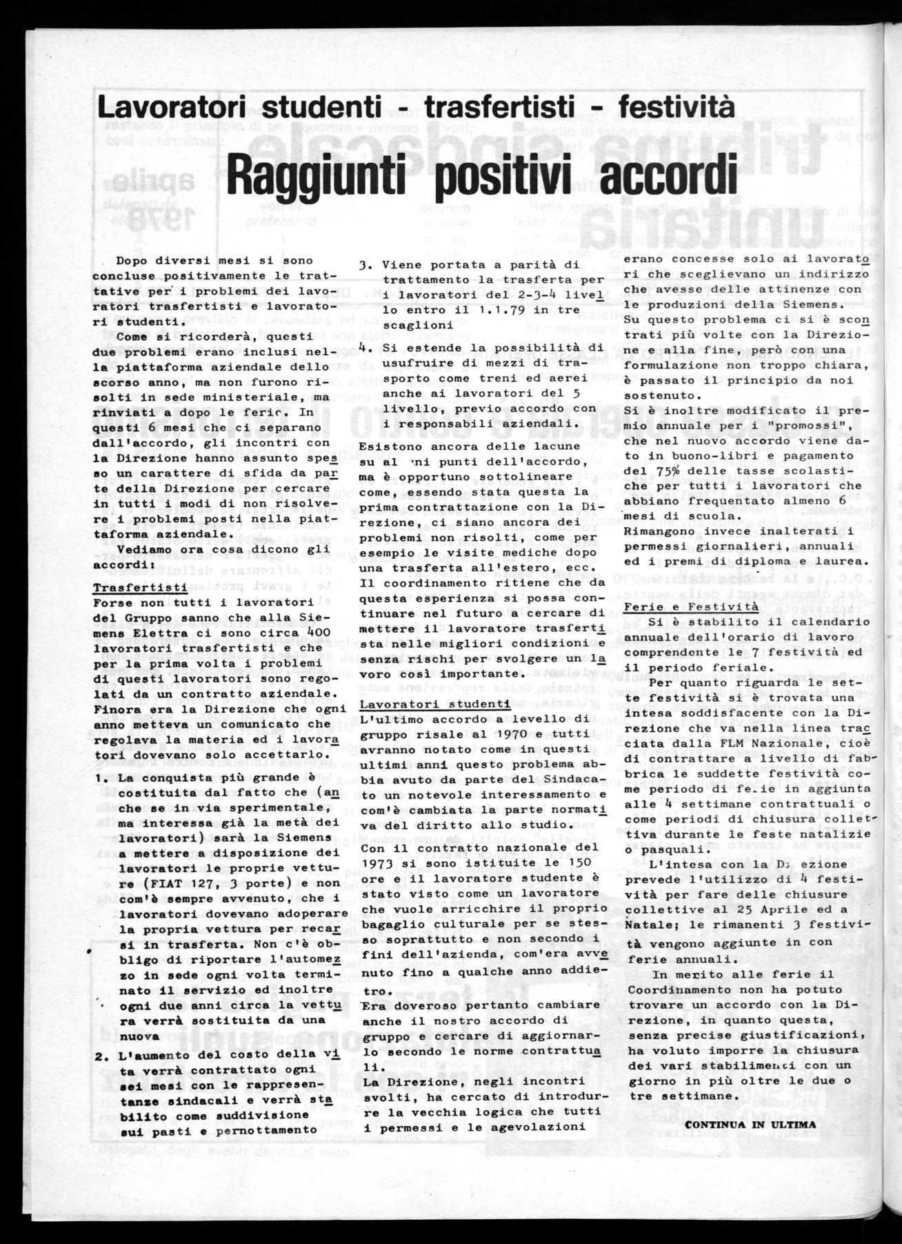 La conquista più grande è costituita dal fatto che (an che se in via sperimentale, ma interessa già la metà dei lavoratori) sarà la Siemens a mettere a disposizione dei lavoratori le proprie vetture (FIAT 127, 3 porte) e non com'è sempre avvenuto, che i lavoratori dovevano adoperare la propria vettura per recar si in trasferta. Non c'è obbligo di riportare l'automez zo in sede ogni volta terminato il servizio ed inoltre ogni due anni circa la vettu ra verrà sostituita da una nuova