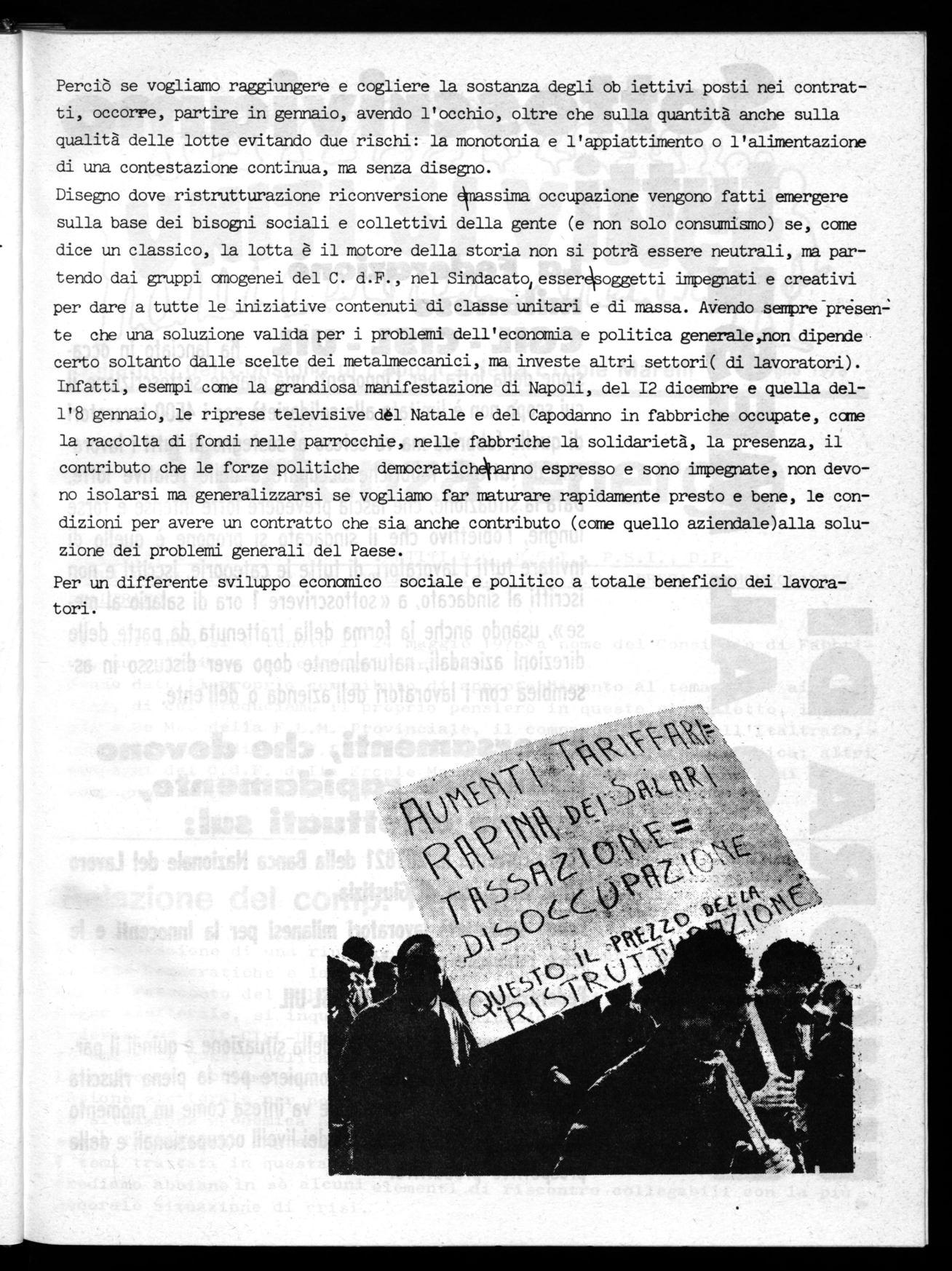 Perciò se vogliamo raggiungere e cogliere la sostanza degli ob iettivi posti nei contratti, occorre, partire in gennaio, avendo l'occhio, oltre che sulla quantità anche sulla qualità delle lotte evitando due rischi: la monotonia e l'appiattimento o l'alimentazione di una contestazione continua, ma senza disegno. Disegno dove ristrutturazione riconversione na.ssima occupazione vengono fatti emergere sulla base dei bisogni sociali e collettivi della gente (e non solo consumismo) se, come dice un classico, la lotta è il motore della storia non si potrà essere neutrali, ma partendo dai gruppi omogenei del C. d.F., nel Sindacatoiesseresoggetti impegnati e creativi per dare a tutte le iniziative contenuti di classe unitari e di massa. Asiendo sempre prèsen-: te che una soluzione valida per i problemi dell'economia e politica generale,non dipende certo soltanto dalle scelte dei metalmeccanici, ma investe altri settori( di lavoratori). Infatti, esempi come la grandiosa manifestazione di Napoli, del 12 dicembre e quella dell'8 gennaio, le riprese televisive dél Natale e del Capodanno in fabbriche occupate, cane la raccolta di fondi nelle parrocchie, nelle fabbriche la solidarietà, la presenza, il contributo che le forze politiche democratichkanno espresso e sono impegnate, non devono isolarsi ma generalizzarsi se vogliamo far maturare rapidamente presto e bene, le condizioni per avere un contratto che sia anche contributo (come quello aziendale)alla soluzione dei problemi generali del Paese. Per un differente sviluppo economico sociale e politico a totale beneficio dei lavoratori.