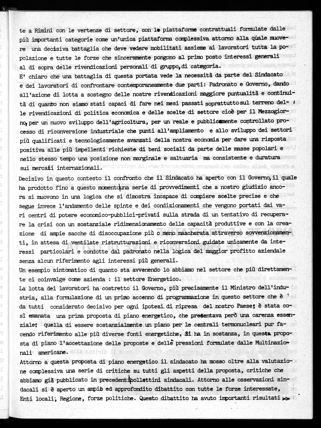 Decisivo in questo contesto il confronto che il Sindacato ha aperto con il Governgil quale ha prodotto fino a questo mcment serie di provvedimenti che a nostro giudizio ancora si muovono in una logica che si dimostra incapace di compiere scelte precise e che segue invece l'andamento delle spinte e dei condizionamenti che vengono portati dai vari centri di potere economico-pubblici-privati sulla strada di un tentativo di recuperare la crisi con un sostanziale ridimensionamento delle capacità produttive e con la creazione di ampie sacche di disoccupazione più organo mascherata attraverso sovvenzionarne/1ti, in attesa di ventilate ristrutturazioni e riconversioni guidate unicamente da interessi particolari e condotte dal padronato nella logica del maggior profitto aziendale senza alcun riferimento agn. interessi più generali. Un esempio sintomatico di quanto sta avvenendo lo abbiamo nel settore che più direttamente ci coinvolge come azienda : il settore Energetico. La lotta dei lavoratori ha costretto il Governo, più precisamente il Ministro dell'industria, alla formulazione di un primo accenno di.programmazione in questo settore che è da tutti considerato decisivo per ogni ipotesi. di. ripresa del nostro Paese; è stata così emanata una prima proposta di piano energetico, che presentava però una carenza essenziale: quella di essere sostanzialmente.un piano per le centrali termonucleari pur facendo riferimento alle più diverse fonti energetiche. si ha in sostanza, in questa. proposta di piano l'accettazione delle proposte e delle' pressioni formulate dalle Multinazionali americane.