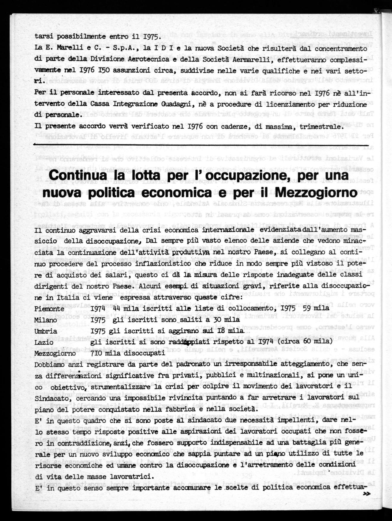Altroelemento è l'impegno della Ditta per assumere 150 lavoratori per l'anno 1976, questo impegno va seguito e controllato costringendo la Ditta a dare Adati e i settori dove questo si verifica, questo problema delle assunzioni va visto anche in merito al mantenimento del centro scuola aziendale, in questo caso bisogna far assumere alla Ditta un impegno di programma per l'anno 1976, per non permettere alla stessa la scusante ed il paravento riferito al discorso del mercato che non dà manodopera qualificata.