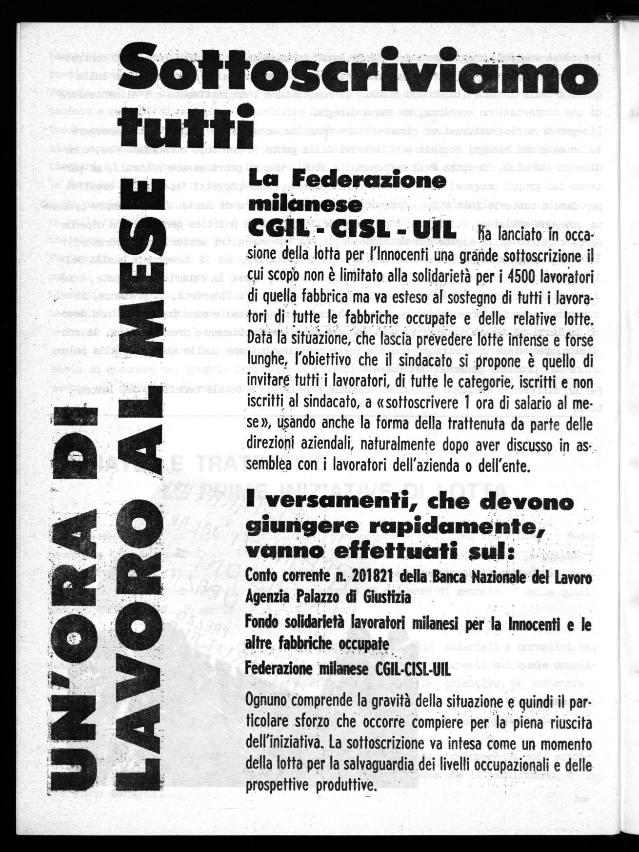 In questo senso una prima risposta all'ASSOLOMBARDA dopo 6 incontri, dove mantiene tutt'ora la pregiudiziale politica, e che l'accordo firmato all'interno della ditta dopo una lunga trattativa portata avanti dal C.d.F.e dal Sindacato di zona e approvata dai lavoratori segna un punto importante a favore dei lavoratori stessi.