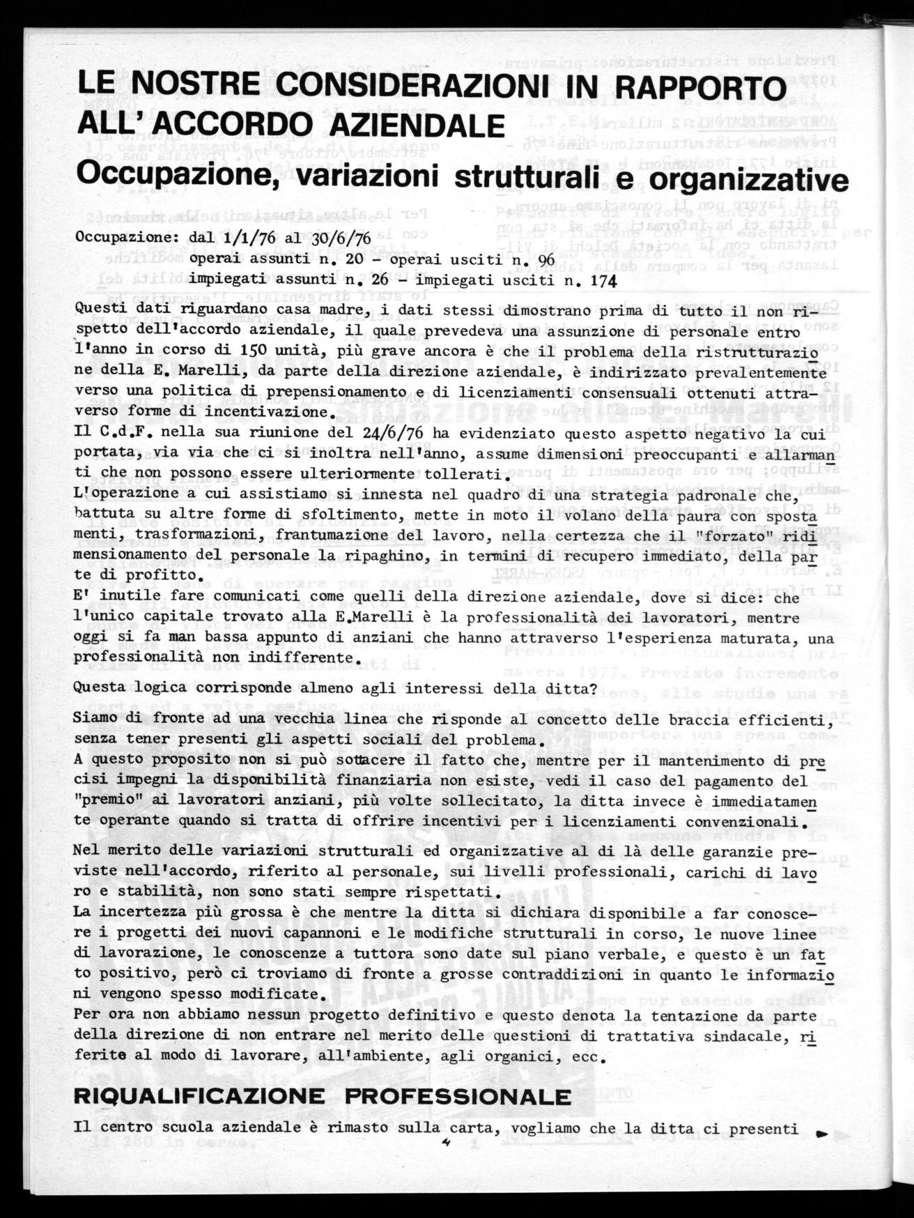 Nel quadro delle verifiche stabilite dall'accordo del 18 dicembre 1975 su investimenti, occupazione, ristrutturazione, ecc. il C.d.F. nella riunione del 24 giugno '76 dopo una valutazione sugli incontri avvenuti con la Direzione del personale e dopo un dibattito, ha deciso di porre all'attenzione di tutti i lavoratori: