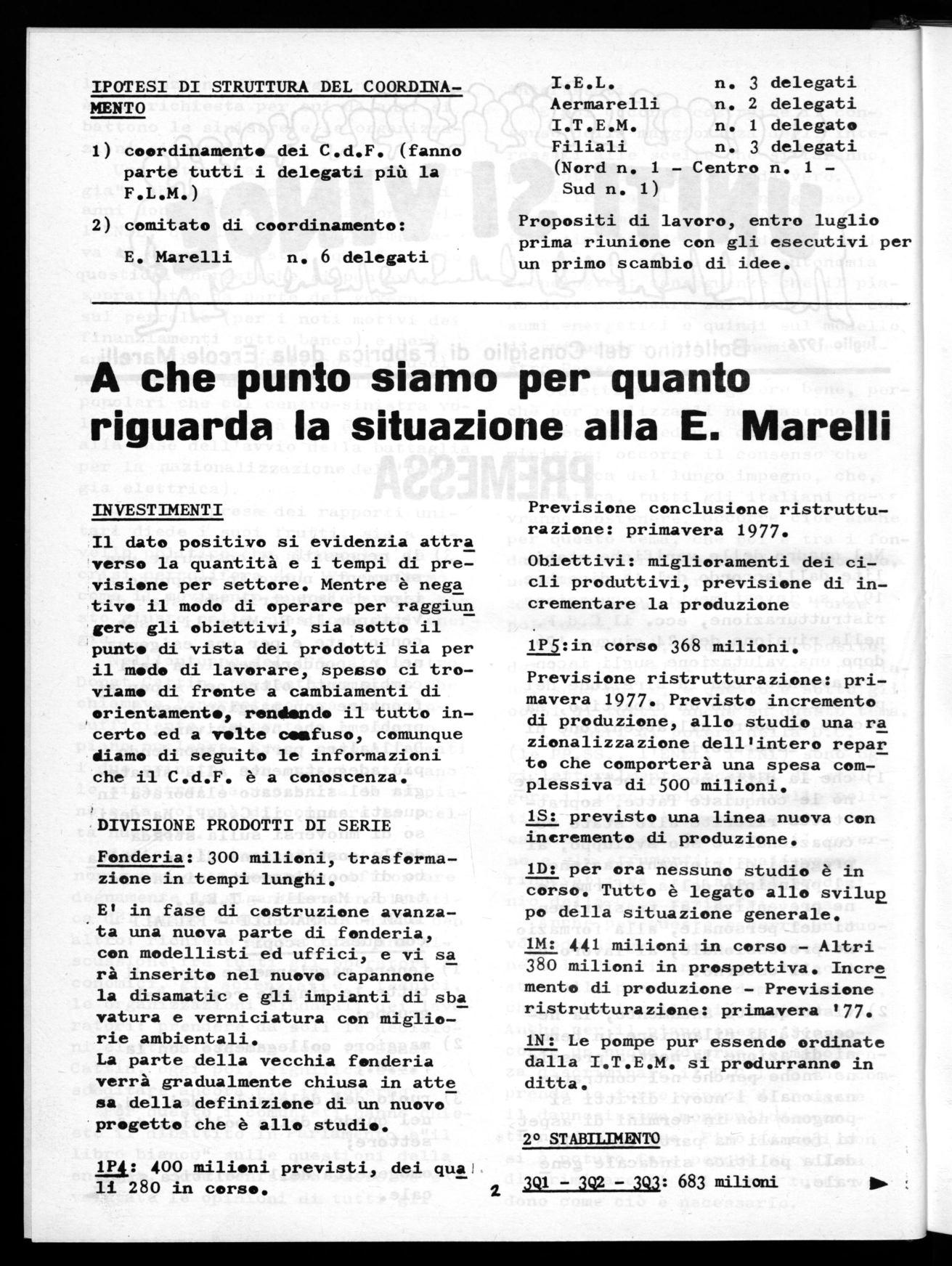 la necessità di costruire uno strumento nuovo in rapporto al tipo di industria che sta' diventando la E. Marelli e sue consociate e per una esigenza nel rispondere meglio a tali cambiamenti oltre nel saper af frontare con maggior peso i problemi che ne derivano. Dall'altra parte rispondendo più adeguatamente alla strategia del sindacato elaborata in questi anni, il C.d.F, ha deci so di muoversi sulla strada della costituzione di un convita to di coordinamento sindacale tra E. Marelli - I.E.L.ITEM - AERMARELLI - FILIALIcon questi scopi: