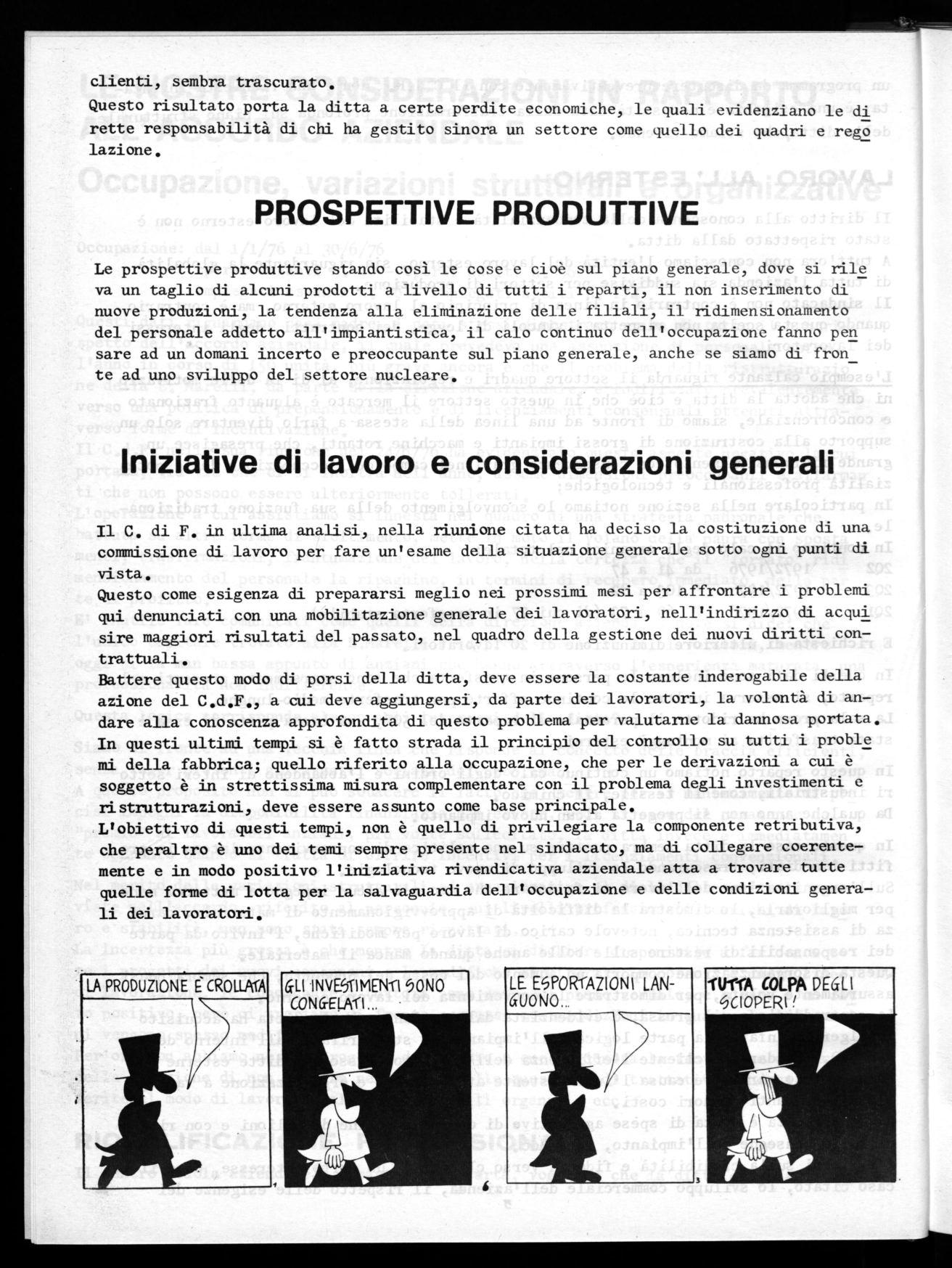 Le prospettive produttive stando così le cose e cioè sul piano generale, dove si rile va un taglio di alcuni prodotti a livello di tutti i reparti, il non inserimento di nuove produzioni, la tendenza alla eliminazione delle filiali, il ridimensionamento del personale addetto all'impiantistica, il calo continuo dell'occupazione fanno pen sare ad un domani incerto e preoccupante sul piano generale, anche se siamo di fron te ad uno sviluppo del settore nucleare.