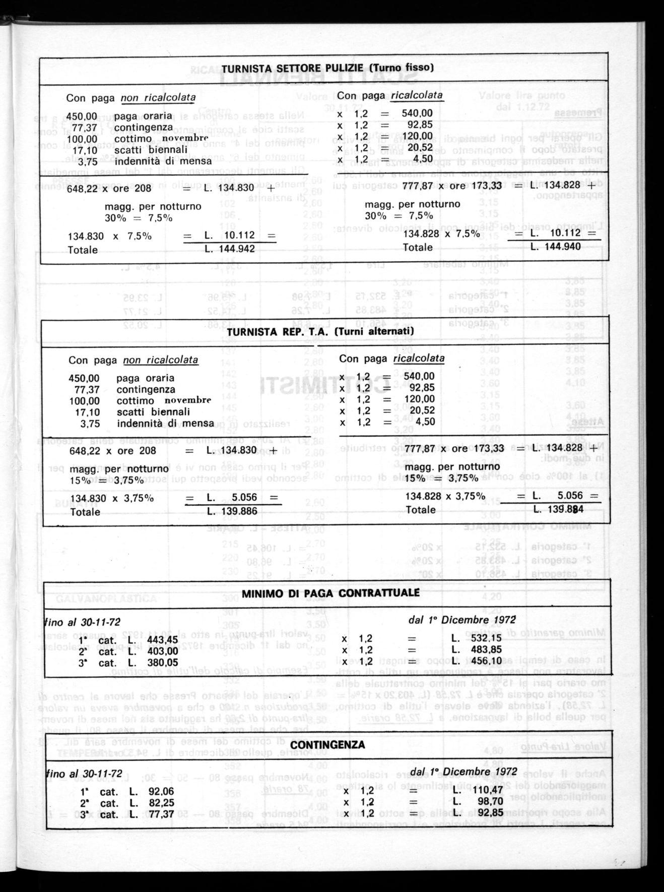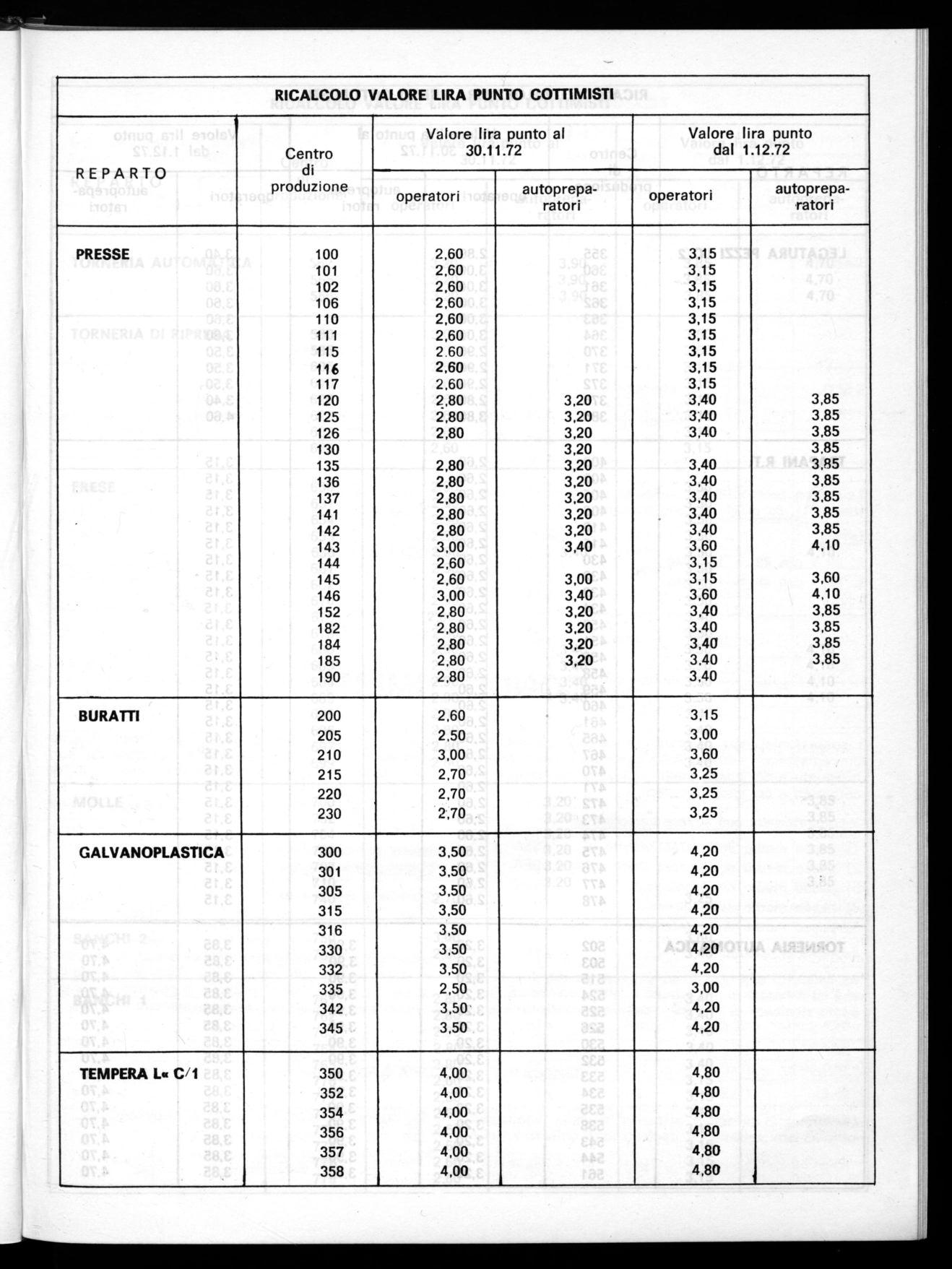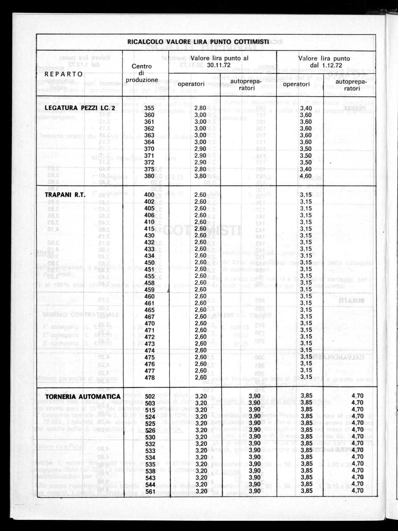 valori lira-punto in atto al 30.11.1972 e quanto saranno dal 1° dicembre 1972ivalori lira-punto ricalcolati.