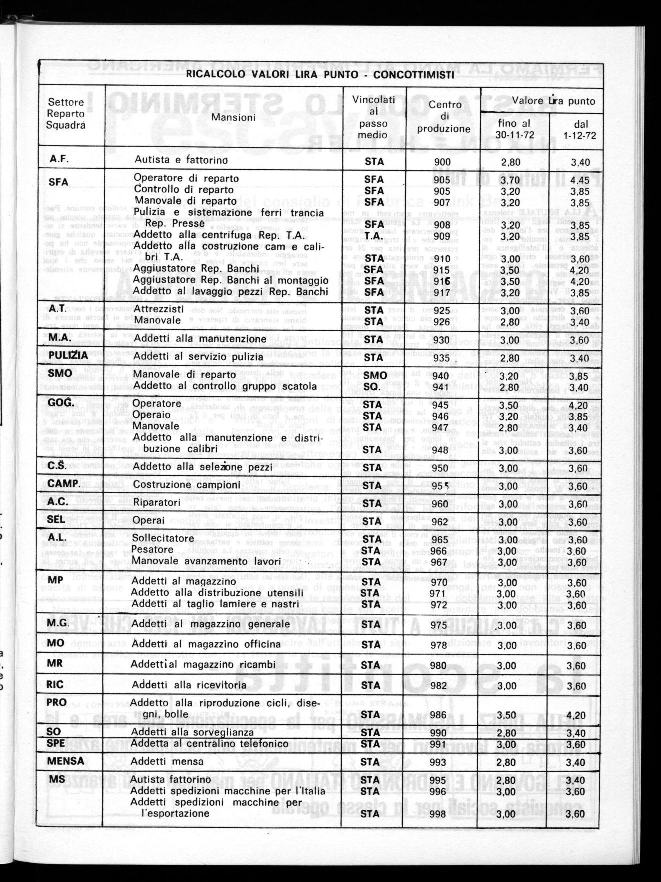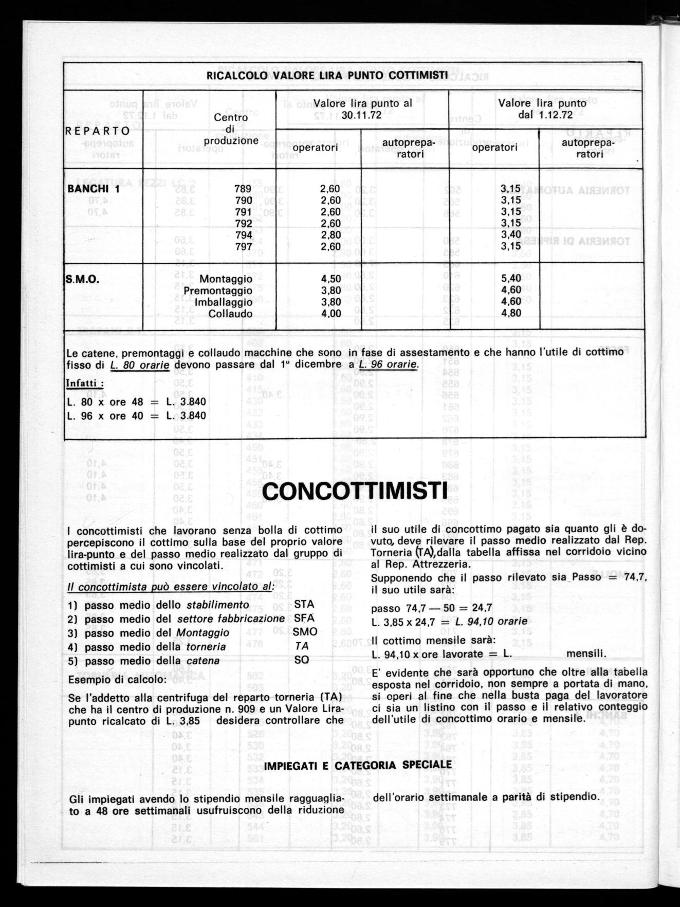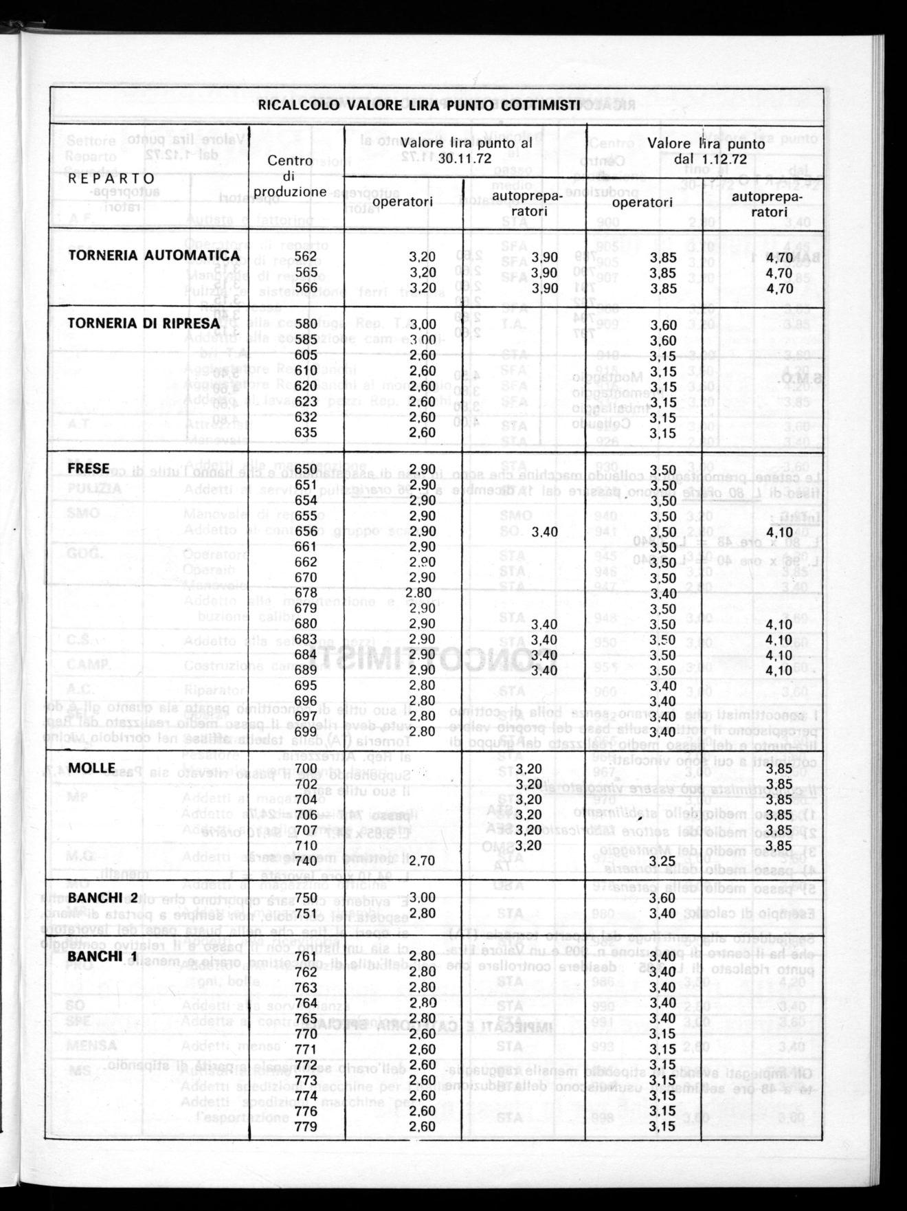 Le catene, premontaggi e collaudo macchine che sono in fase di assestamento e che hanno l'utile di cottimo fisso di L. 80 orarie devono passare dal 10 dicembre a L. 96 orarie.