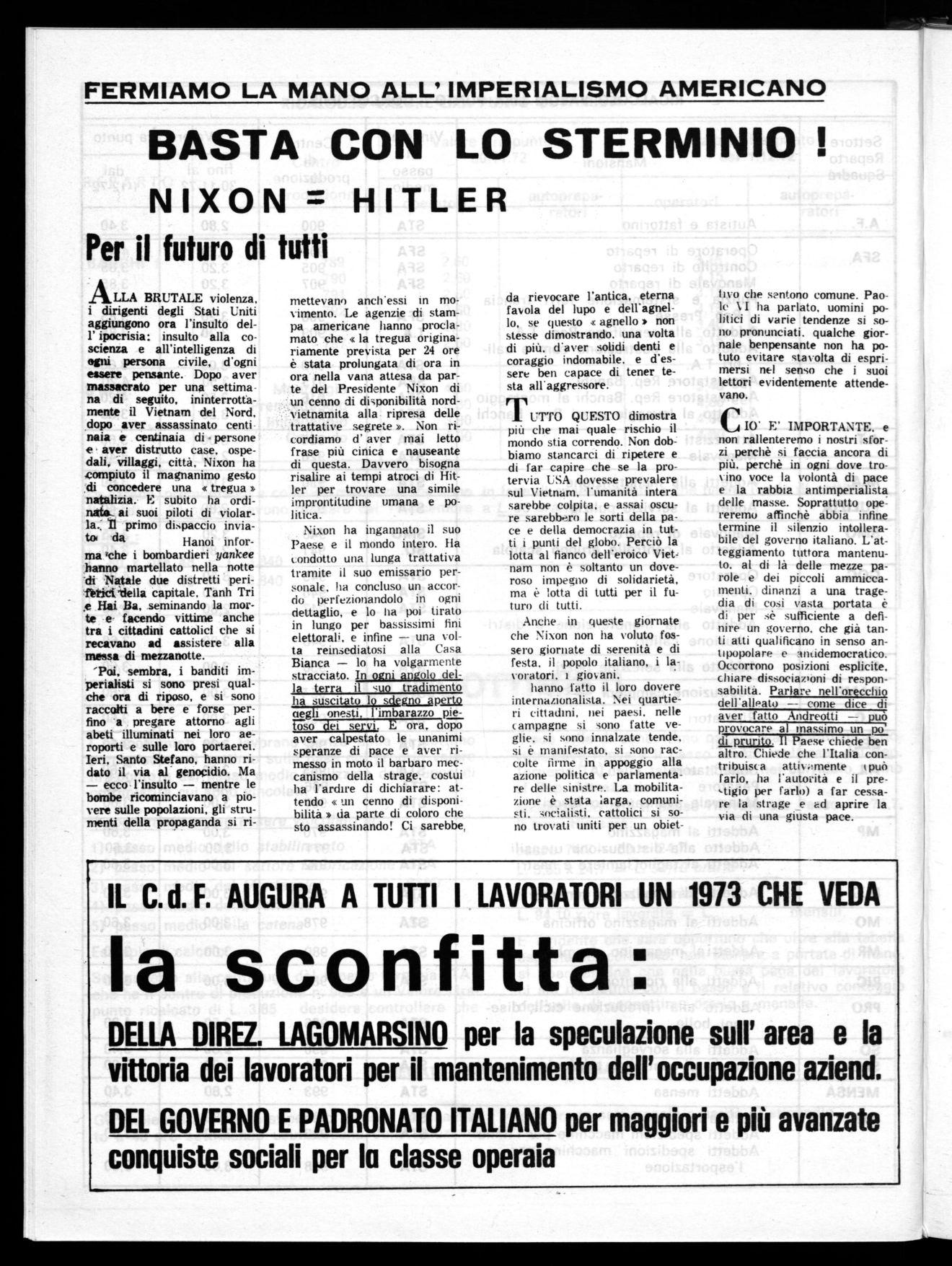 CIO' E' IMPORTANTE. e non rallenteremo i nostri sforzi perchè si faccia ancora di più. parche in ogni dove trovino voce la volontà di pace e la rabbia antimperialista delle masse. Soprattutto opel reremo affinchè abbia infine termine il silenzio intollerabile del governo italiano. L'atteggiamento tuttora mantenuto. al di là delle mezze parole e dei piccoli ammiccamenti. dinanzi a una tragedia di cosi vasta portata è di per sè sufficiente a definire un governo, che già tanti atti qualificano in senso antipopolare e antidemocratico. Occorrono posizioni esplicite, chiare dissociaDoni di responsabilità. Parlare nell'orecchio dell'alleato -- come dice di aver fatto Andreotti — può provocare al massimo un di prurito. Il Paese chiede ben altro. Chiede che l'Italia contribuisca attivilmente k può farlo, ha l'autorità e il prestigio per farlo) a far cessare la strage e ed aprire la via di una giusta pace. IL C. d. F. AUGURA A TUTTI I LAVORATORI UN 1973 CHE
