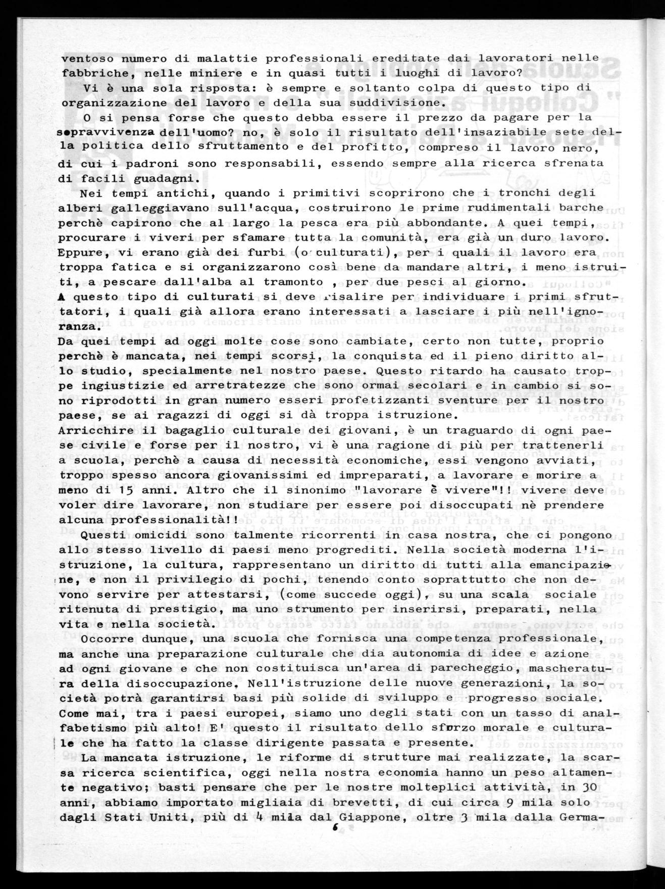 Dall'attuale classe dirigente, arroccata su poltrone rivestite di pelle umana e dai suoi culturati, i lavoratori per primi non si lasceranno incantare. Il tempo dei patrizi è finito! Delusi, siete forse stanchi? Più realismo se non volete che le strutture ormai corrose di questa società vi crollino addosso. Lavoratori, lottare e battere le tendenze a limitare l'istruzione. Sconfiggere la scuola tradizionale Gentiliana che ha avuto solo il compito di preparare èlit destinate a dirigere l'economia del paese solo per proprio profitto.