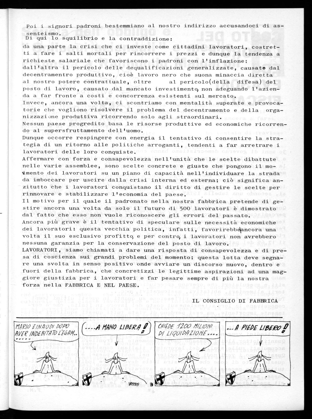 E.G.A.M. che significa soldi della comunità . Si tratta di ristrutturarle e modificare il tipo di produzione, ma per ora c'è il pericolo di lasciare sul lastrico migliaia di lavoratori. Riuscire a capire le vere ragioni non è cosa da poco, perchè quando funzionavano, altri incassavani i miliardi. Tra queste fabbriche sembra ve ne siano alcune che hanno attinenza con il nostro _tipo di lavoro tramite il loro prodotto; se fra di esse ve ne sono che attraversano momenti difficili, quali ripercussioni potrebbe avere il rilancio della produzione industriale nel nostro paese , e per quel che ci riguarda nella nostra fabbrica?