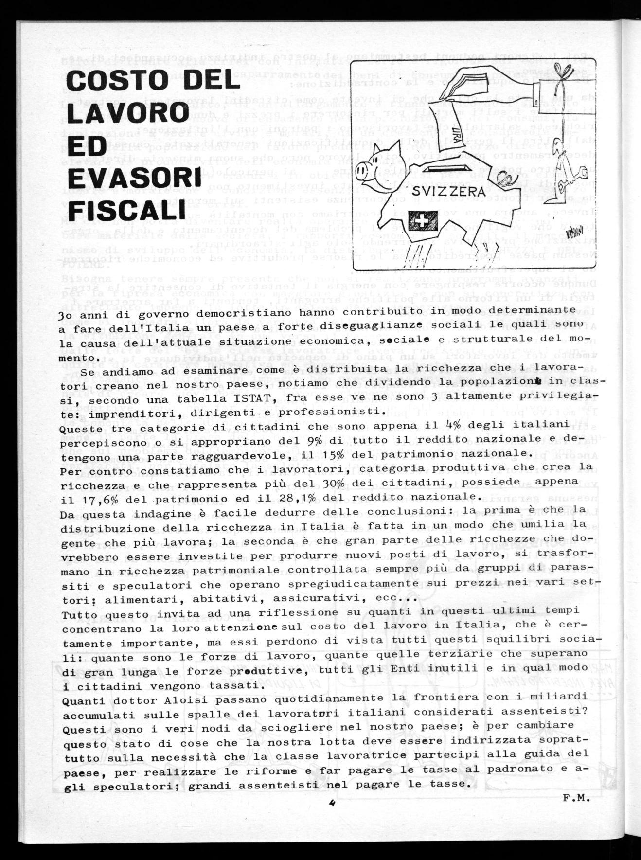 Di qui lo squilibrio e la contraddizione: da una parte la crisi che ci investe come cittadini lavoratori, costretti a fare i salti mortali per rincorrere i prezzi e dunque la tendenza a richieste salariale che favoriscono i padroni con l'inflazione; dall'altra il pericolo delle dequalificazioni generalizzate, causato dal decentramentro produttivo, cioè lavoro nero che suona minaccia diretta al nostro potere contrattuale, oltre al pericolo(della difesa) del posto di lavoro, causato dal mancato investimentg non adeguando l'azienda a far fronte a costi e concorrenza esistenti sul mercato.