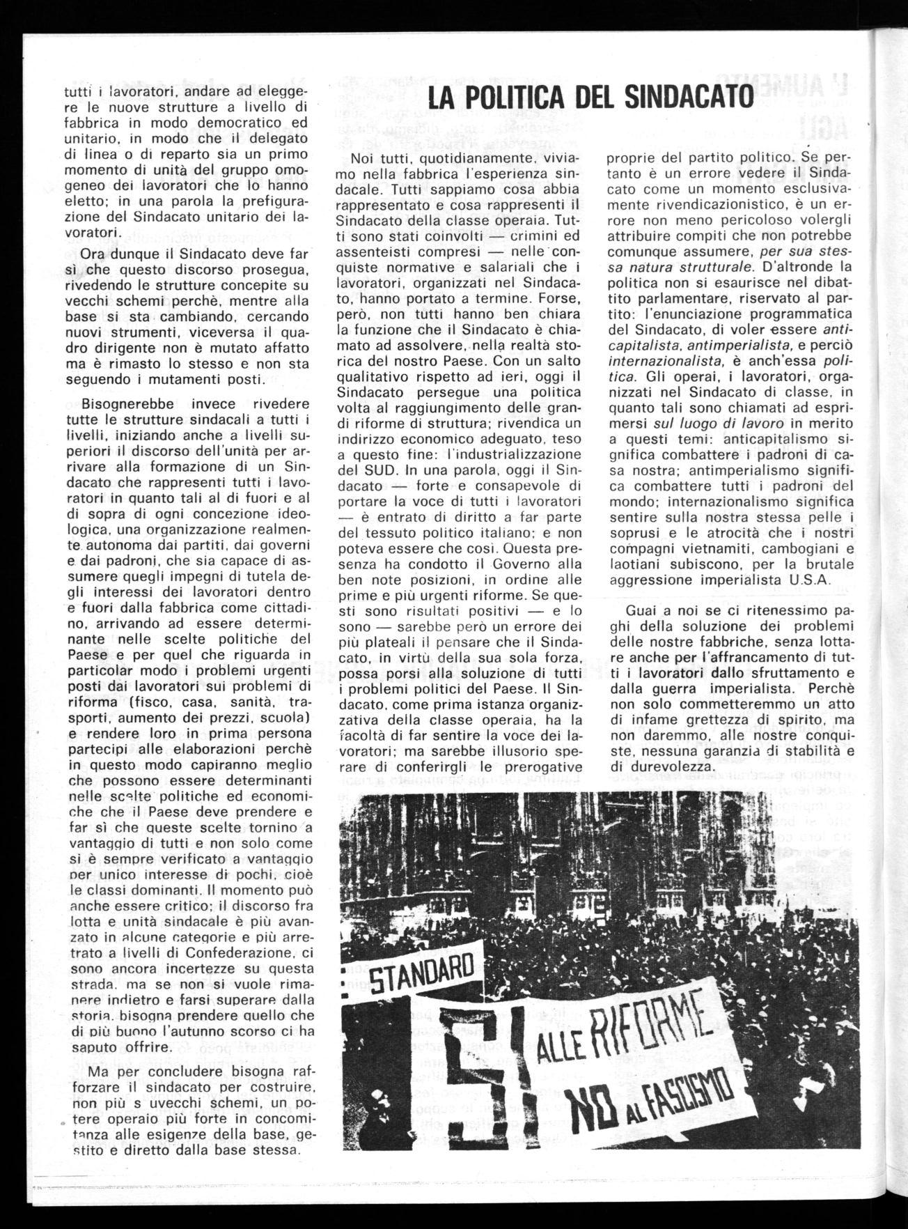 proprie del partito politico. Se pertanto è un errore vedere il Sindacato come un momento esclusivamente rivendicazionistico, è un errore non meno pericoloso volergli attribuire compiti che non potrebbe comunque assumere, per sua stessa natura strutturale. D'altronde la politica non si esaurisce nel dibattito parlamentare, riservato al partito: l'enunciazione programmatica del Sindacato, di voler essere anticapitalista, antimperialista, e perciò internazionalista, è anch'essa politica. Gli operai, i lavoratori, organizzati nel Sindacato di classe, in quanto tali sono chiamati ad esprimersi sul luogo di lavoro in merito a questi temi: anticapitalismo significa combattere i padroni di casa nostra; antimperialismo significa combattere tutti i padroni del mondo; internazionalismo significa sentire sulla nostra stessa pelle i soprusi e le atrocità che i nostri compagni vietnamiti, cambogiani e laotiani subiscono, per la brutale aggressione imperialista U.S.A.