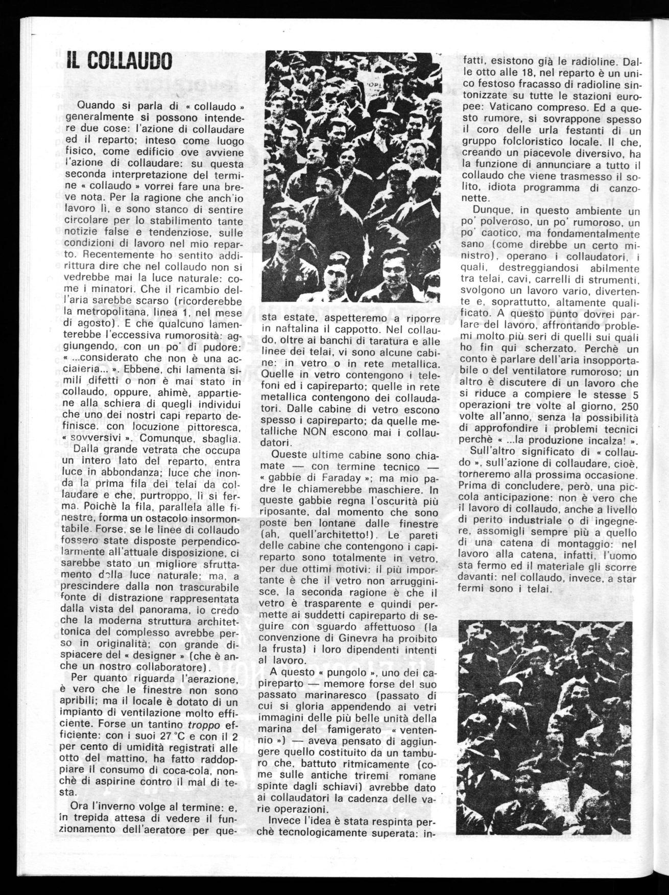 Quando si parla di « collaudo » generalmente si possono intendere due cose: l'azione di collaudare ed il reparto; inteso come luogo fisico, come edificio ove avviene l'azione di collaudare: su questa seconda interpretazione del termine « collaudo » vorrei fare una breve nota. Per la ragione che anch'io lavoro lì, e sono stanco di sentire circolare per lo stabilimento tante notizie false e tendenziose, sulle condizioni di lavoro nel mio reparto. Recentemente ho sentito addirittura dire che nel collaudo non si vedrebbe mai la luce naturale: come i minatori. Che il ricambio dell'aria sarebbe scarso (ricorderebbe la metropolitana, linea 1, nel mese di agosto). E che qualcuno lamenterebbe l'eccessiva rumorosità: aggiungendo, con un po' di pudore: ...considerato che non è una acciaieria... ». Ebbene, chi lamenta simili ,difetti o non è mai stato in collaudo, oppure, ahimè, appartiene alla schiera di quegli individui che uno dei nostri capi reparto definisce. con locuzione pittoresca, sovversivi ». Comunque, sbaglia. Dalla grande vetrata che occupa un intero lato del reparto, entra luce in abbondanza; luce che inonda la prima fila dei telai da collaudare e che, purtroppo, lì si ferma. Poichè la fila, parallela alle finestre, forma un ostacolo insormontabile. Forse, se le linee di collaudo fossero state disposte perpendicolarmente all'attuale disposizione, ci sarebbe stato un migliore sfruttamento cl-_‘.11a luce naturale; ma, a prescindere dalla non trascurabile fonte di distrazione rappresentata dalla vista del panorama, io credo che la moderna struttura architettonica del complesso avrebbe perso in originalità; con grande dispiacere del « designer » (che è anche un nostro collaboratore).