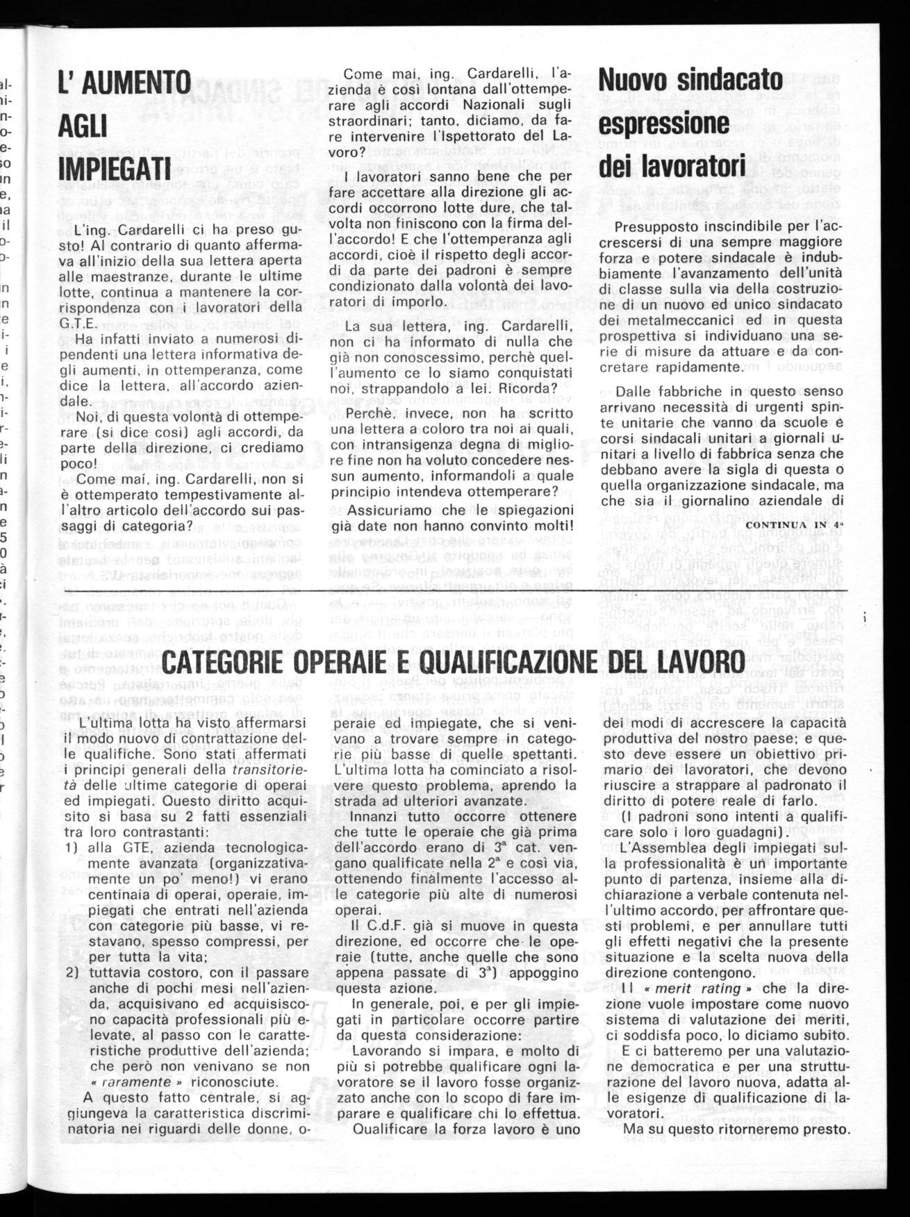 La sua lettera, ing. Cardarelli, non ci ha informato di nulla che già non conoscessimo, perchè quell'aumento ce lo siamo conquistati noi, strappandolo a lei. Ricorda?