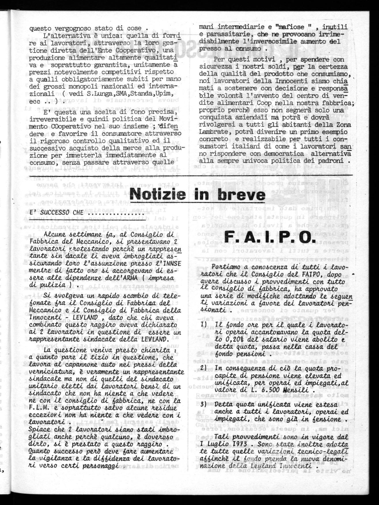 Per questi motivi , per spendere con sicurezza i nostri soldi, pgr la certezza della qualità del prodotto che consumiamo, noi lavoratori della Innocenti siamo chia mati a sostenere con decisione e respong bile volontà l'avvento del centro di vendite alimentari Coop nella nostra fabbrica; proprio perchè esso non segnerà solo una conquista aziendali ma potrà e dovrà rivolgersi a tutti gli abitanti della Zona. Lambrate, potrà divenire un primo esempio concreto e realizzabile per tutti i consumatori italiani di come i lavoratori san no rispondere con democratica alternativa alla sempre univoca politica dei padroni .