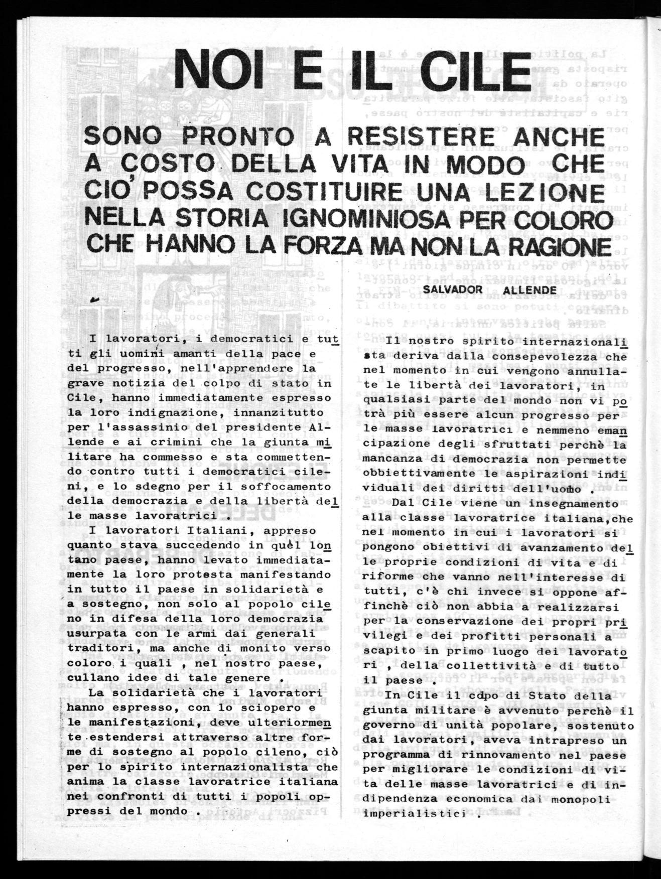 I lavoratori italiani, e non solo essi, guardavano con interesse ai mutamenti che avvenivano in Cile sot to la direzione del Governo Allende perciò hanno immediatamente levato la loro protesta contro il colpo di stato perchè la lotta di emancipazione di quel popolo era, anche se in forme e contenuti diversi, la lot ta e le aspirazioni della classe la voratrice italiana .