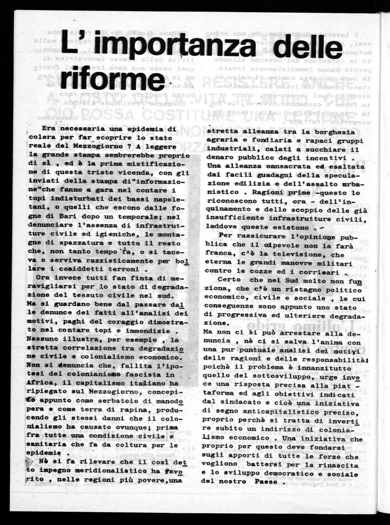 9,-trelf.•Era necessaria una epidemia di colera per far scoprire lo stato reale del Mezzogiorno ? A leggere la grande stampa sembrerebbe proprio di si , ed è la prima mistificazione di questa triste vicenda, con gli inviati della stampa di"informazione"che fanno a gara nel contare i topi indisturbati dei bassi napoletani, o quelli che escono dalle fogne di Bari dopo un temporale; nel denunciare l'assenza di infrastrutture civile ed igieniche, le montagne di spazzatura e tutto il resto che, non tanto tempo'i'a, o si taceva o serviva razzisticamente per bol lire i coaiddetti terroni