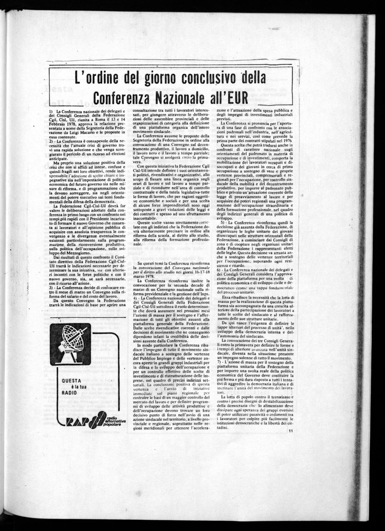 La Federazione Cgil-Cisl-Uil dovrà far valere le deliberazioni adottate dalla conferenza in primo luogo con un confronto nei tempi più rapidi con il Presidente incaricato dí formare il nuovo Governo che consenta ai lavoratori e all'opinione pubblica di acquisire con assoluta trasparenza le convergenze e le divergenze eventualmente esistenti particolarmente sulla programmazione, della riconversione produttiva, sulla politica dell'occupazione, sullo sviluppo del Mezzogiorno.