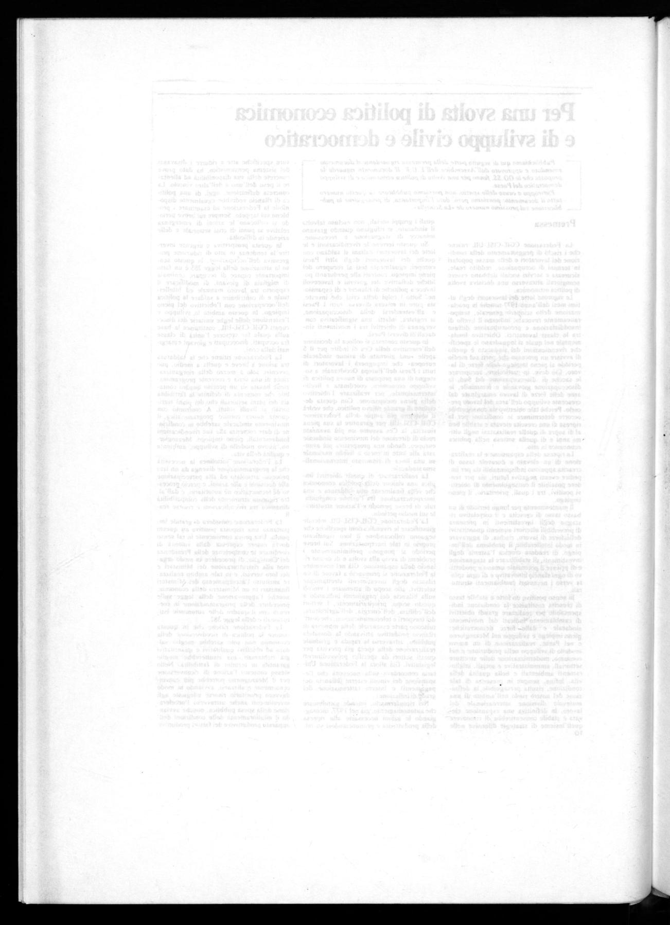 La Federazione sottolinea la necessità che la programmazione divenga da un lato processo articolato ed alta partecipazione alle decisioni e alle azioni, e perciò processo nè tecsocratico nè autoritario, e dall'al. tro rigoroso strumento della compatibilità dinamica tra rivendicazioni i: risorse reali.