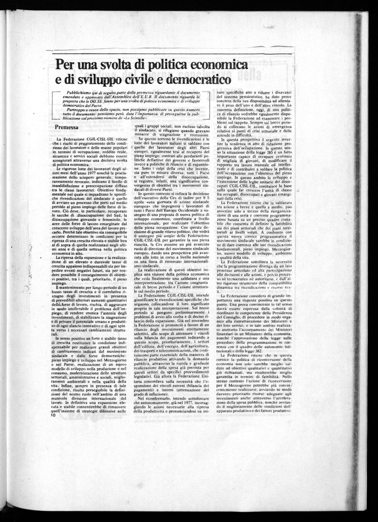 Le vigorose lotte dei lavoratori degli ultimi mesi dell'anno 1977 nonchè la proclamazione dello sciopero generale, temporaneamente revocato. indicano il livello di insoddisfazione e preoccupazione diffuso tra le classi lavoratrici. Obiettivo fondamentale nel quale si inquadrano le specifiche rivendicazioni del sindacato è quello di avviare un processo che porti sul medio periddo al pieno impiego delle forze di lavoro. Ciò deve, in particolare, recuperare le sacche di _disoccupazione del Sud, la disoccupazione giovanile e femminile, le aree delle forze di lavoro emarginate dal crescente sviluppo dell'area del lavoro precario. Perchè tale obiettivo sia conseguibile occorre determinare le condizioni per la ripresa di una crescita elevata e stabile ben al di sopra di quella realizzatasi negli ultimi anni e di quella sottesa nella politica economica in atto.