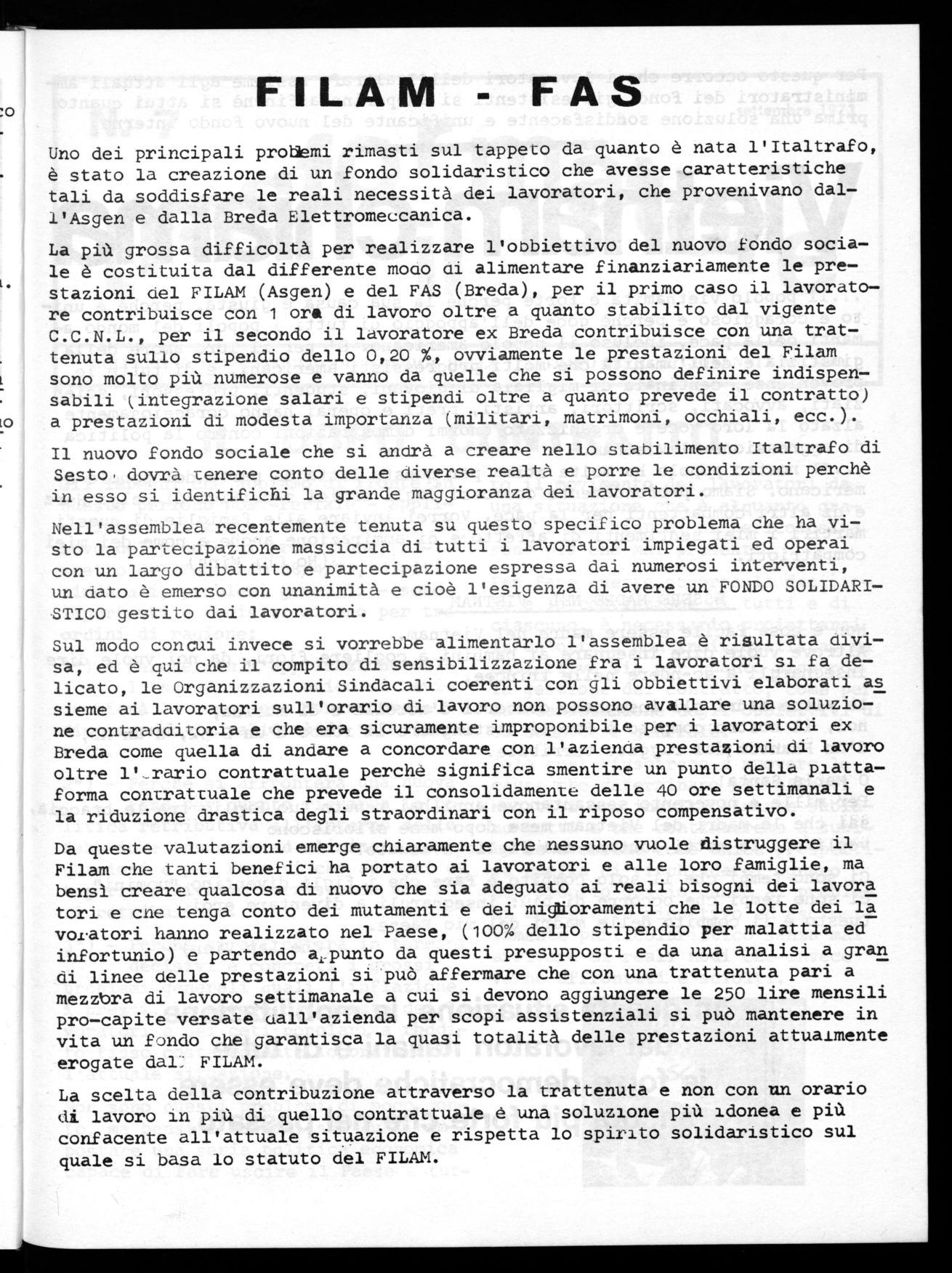 Sul modo con Cui invece si vorrebbe alimentarlo l'assemblea è risultata divisa, ed è qui che il compito di sensibilizzazione fra i lavoratori si fa delicato, le Organizzazioni Sindacali coerenti con gli obbiettivi elaborati as sieme ai lavoratori sull'orario di lavoro non possono avallare una soluzione contradaitoria e che era sicuramente improponibile per i lavoratori ex Breda come quella di andare a concordare con l'azienda prestazioni di lavoro oltre r_rario contrattuale perché significa smentire un punto della piattaforma contrattuale che prevede il consolidamenti: delle 40 ore settimanali e la riduzione drastica degli straordinari con il riposo compensativo. Da queste valutazioni emerge chiaramente che nessuno vuole distruggere il Filam che tanti benefici ha portato ai lavoratori e alle loro famiglie, ma bensì creare qualcosa di nuovo che sia adeguato ai reali bisogni dei lavora tori e cne tenga conto dei mutamenti e dei miglioramenti che le lotte dei la voratori hanno realizzato nel Paese, (100% dello stipendio per malattia ed infortunio) e partendo alpunto da questi presupposti e da una analisi a gran di linee delle prestazioni si può affermare che con una trattenuta pari a mezzbra di lavoro settimanale a cui si devono aggiungere le 250 lire mensili pro-capite versate uall'azienda per scopi assistenziali si può mantenere in vita un fondo che garantisca la quasi totalità delle prestazioni attualmente erogate dal: FILAM.